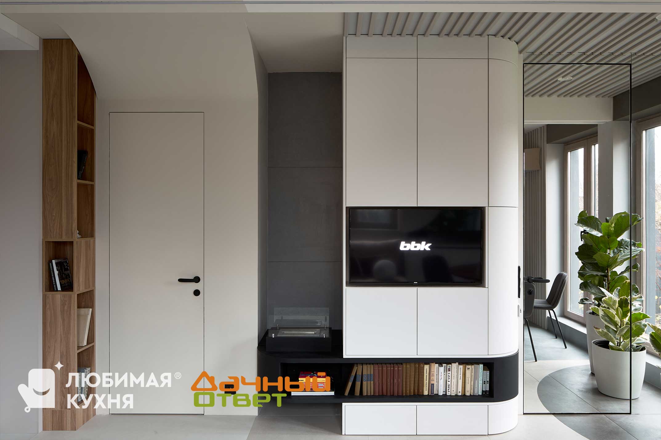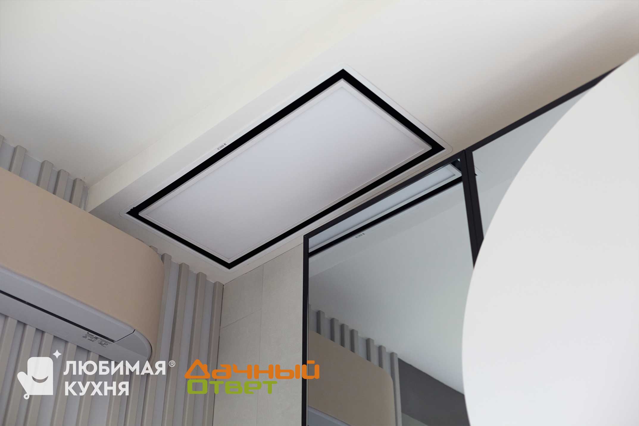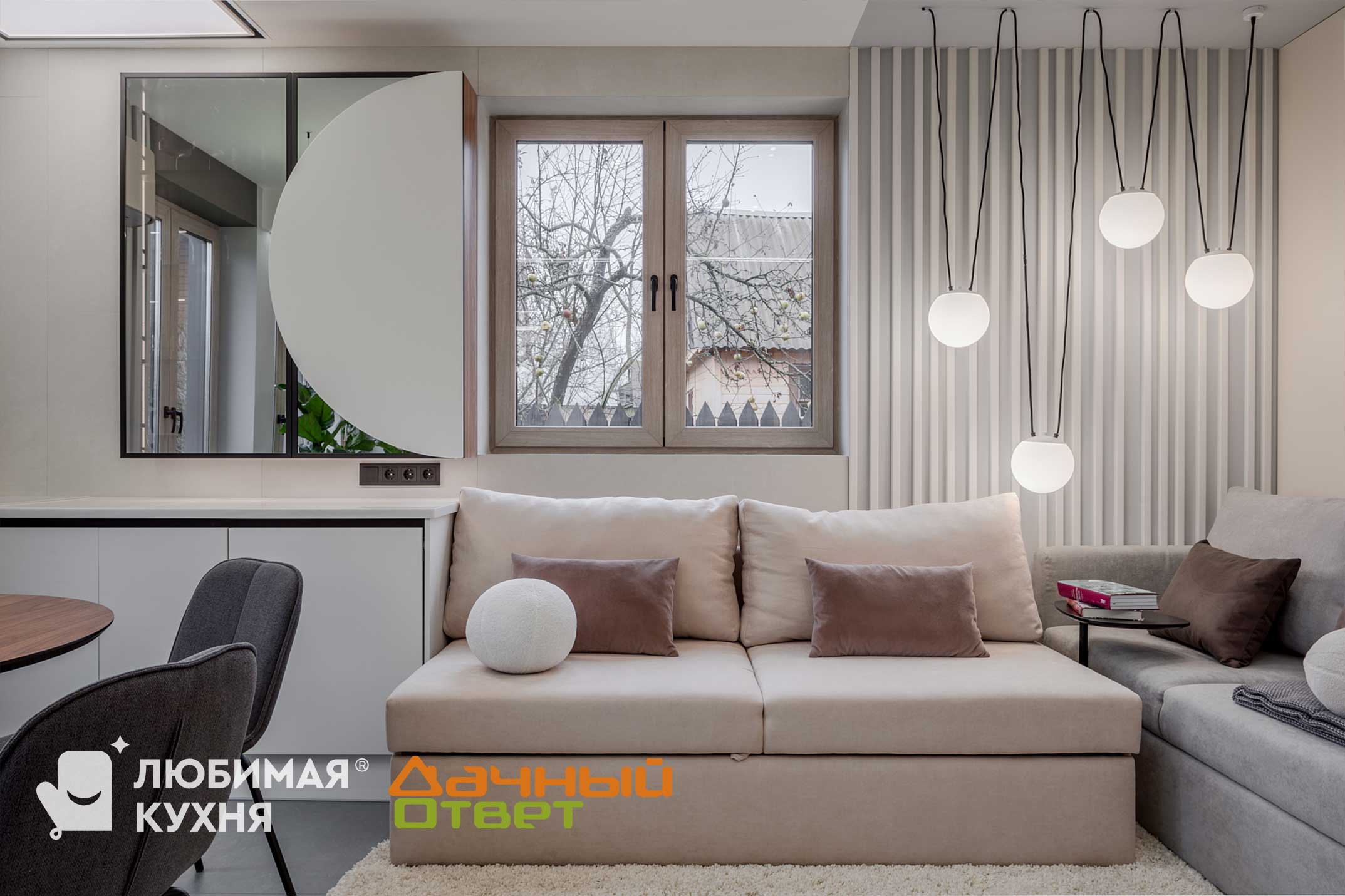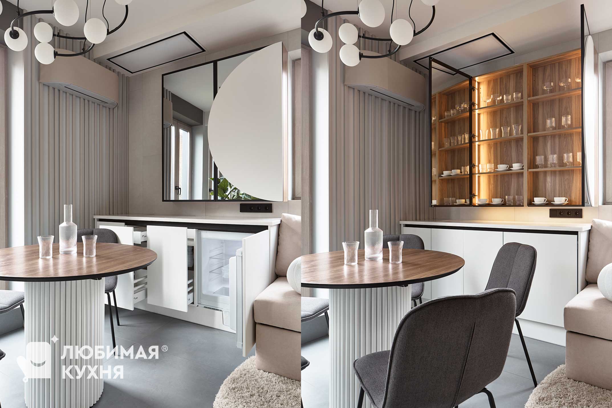 В основе модулей – влагостойкие ЛДСП. Снаружи – термостойкие МДФ-плиты. В напольных тумбах разместились многочисленные выдвижные ящики, а вместо ручки графичный профиль Гола. Кухонную композицию дополняют две верхние секции в оттенке «орех», дополненные подсветкой. Они хоть и узкие, но довольно вместительные, с несколькими полками в каждой. От посторонних глаз их скрывают навешенные на усиленные петли зеркальные дверцы с символом проекта – кругом.