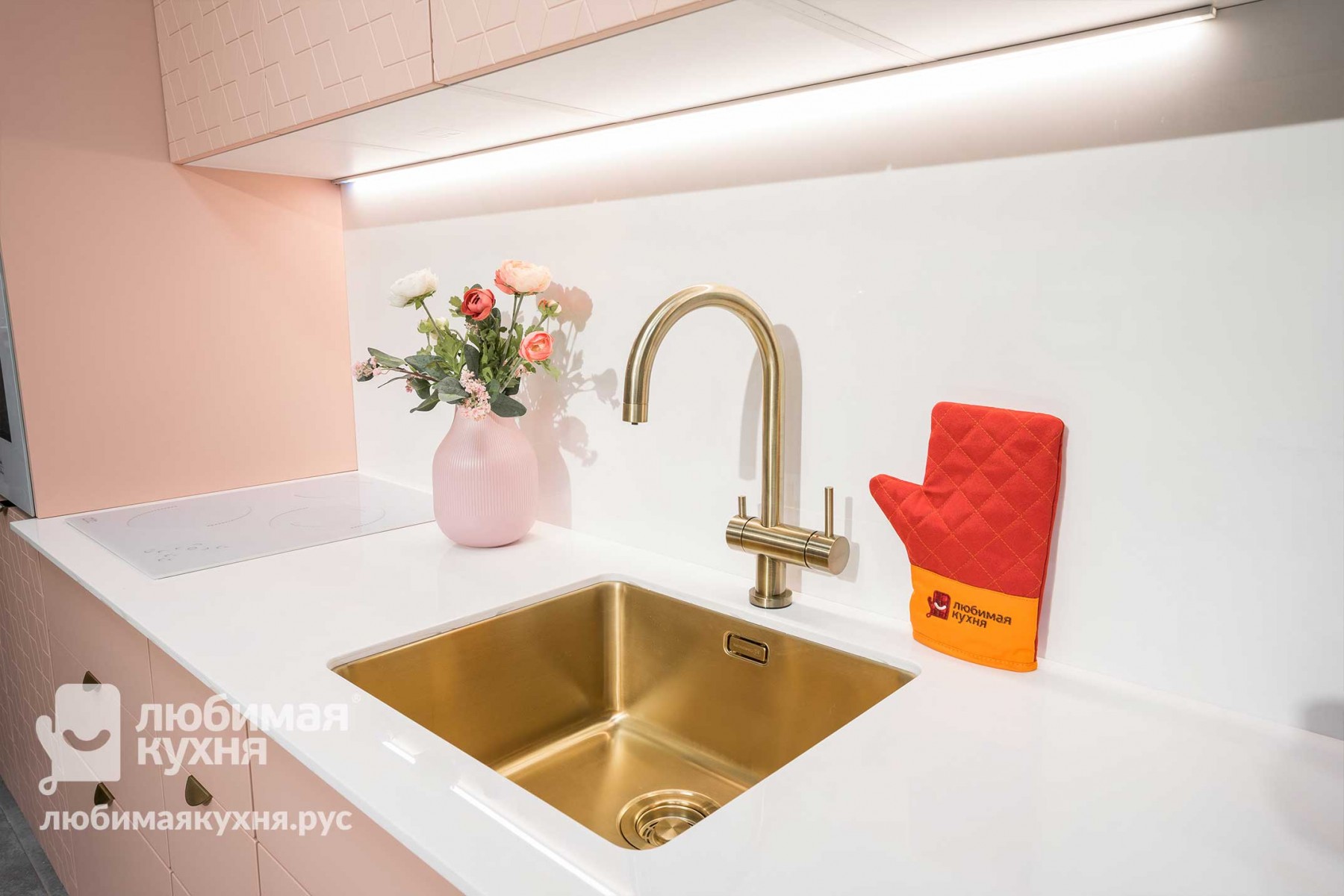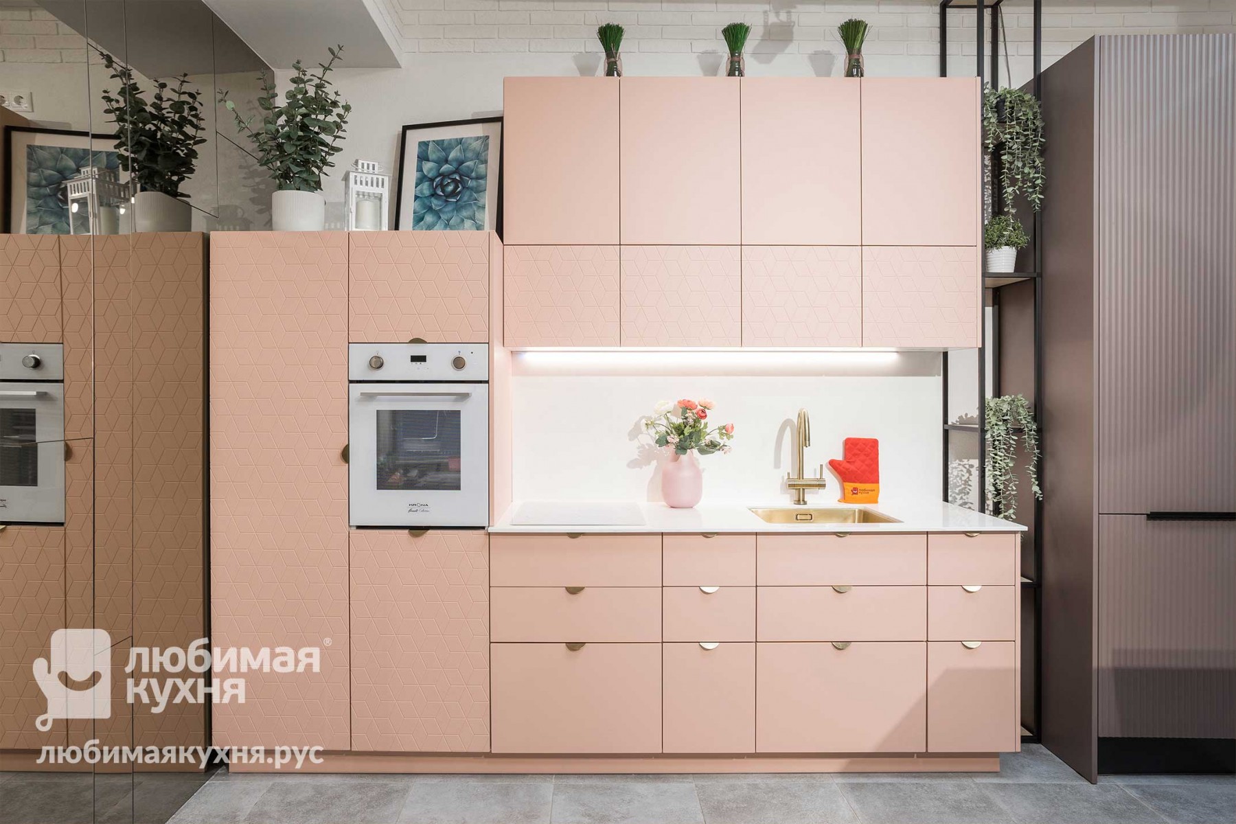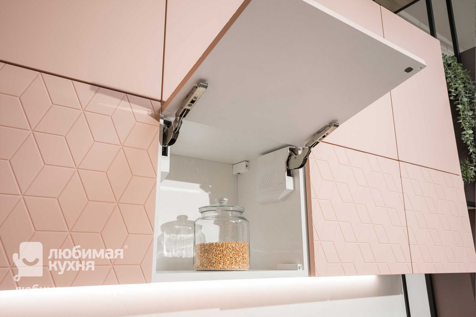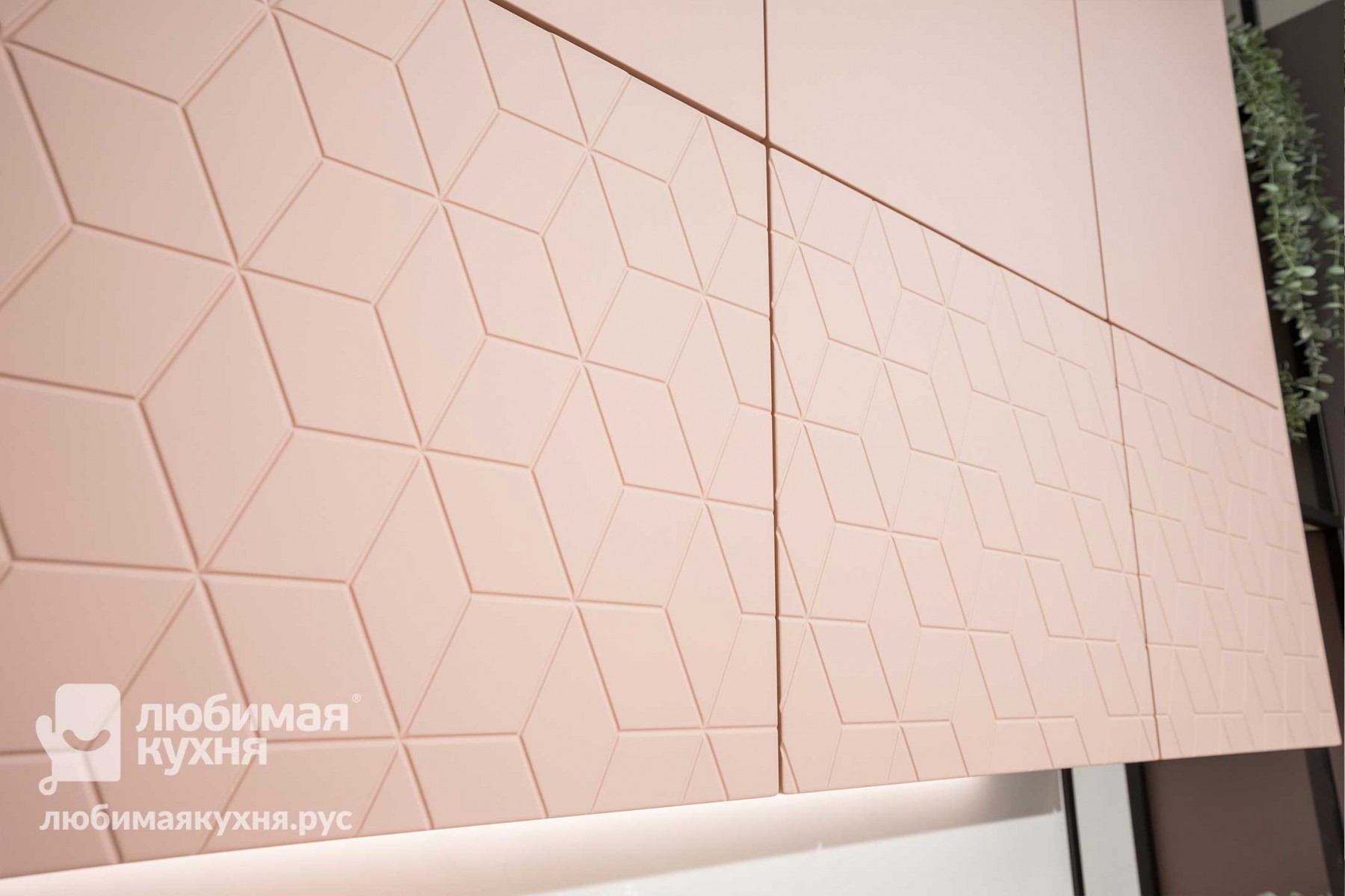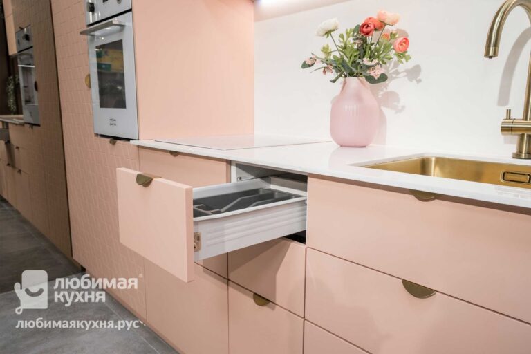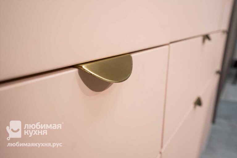 Компактный гарнитур в невероятном пудровом оттенке с ультрамодной фрезеровкой отлично подойдет для утонченных натур, ценящих эстетику и функциональность