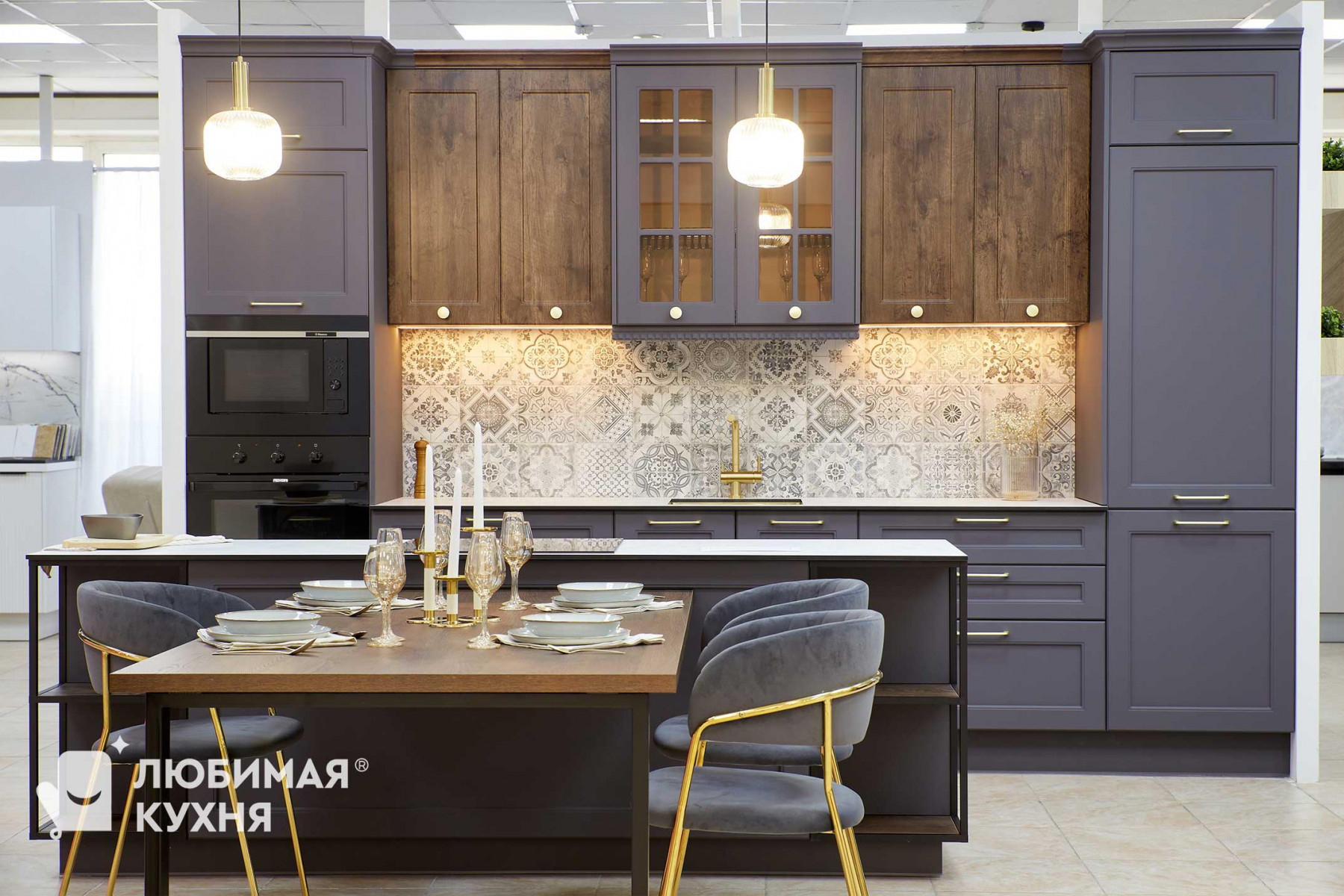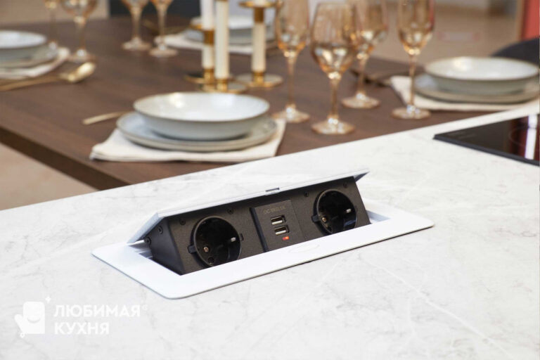 Наша новинка, кухня «Дербшир» будет актуальна не один десяток лет благодаря суперсовременной фурнитуре, технике, наполнению, материалам в сочетании с классическим дизайном и таланту наших дизайнеров. В ней присутствуют: ультратонкая (всего 12 мм), но стойкая и прочная столешница с возможностью установки мойки подстольного монтажа; японская мойка и смеситель Omoikiri в трендовом золотом цвете с 15-ти летней гарантией; трендовые полки из металлического профиля в острове. Выдвижные ящики на фурнитуре лучшего качества (Hettich, Германия) с плавным и бесшумным выдвижением в необычном антрацитовом цвете; горизонтальная встроенная в столешницу острова розетка-невидимка. Слегка нажмите на нее и заряжайте свои гаджеты или питайте мелкую бытовую технику.