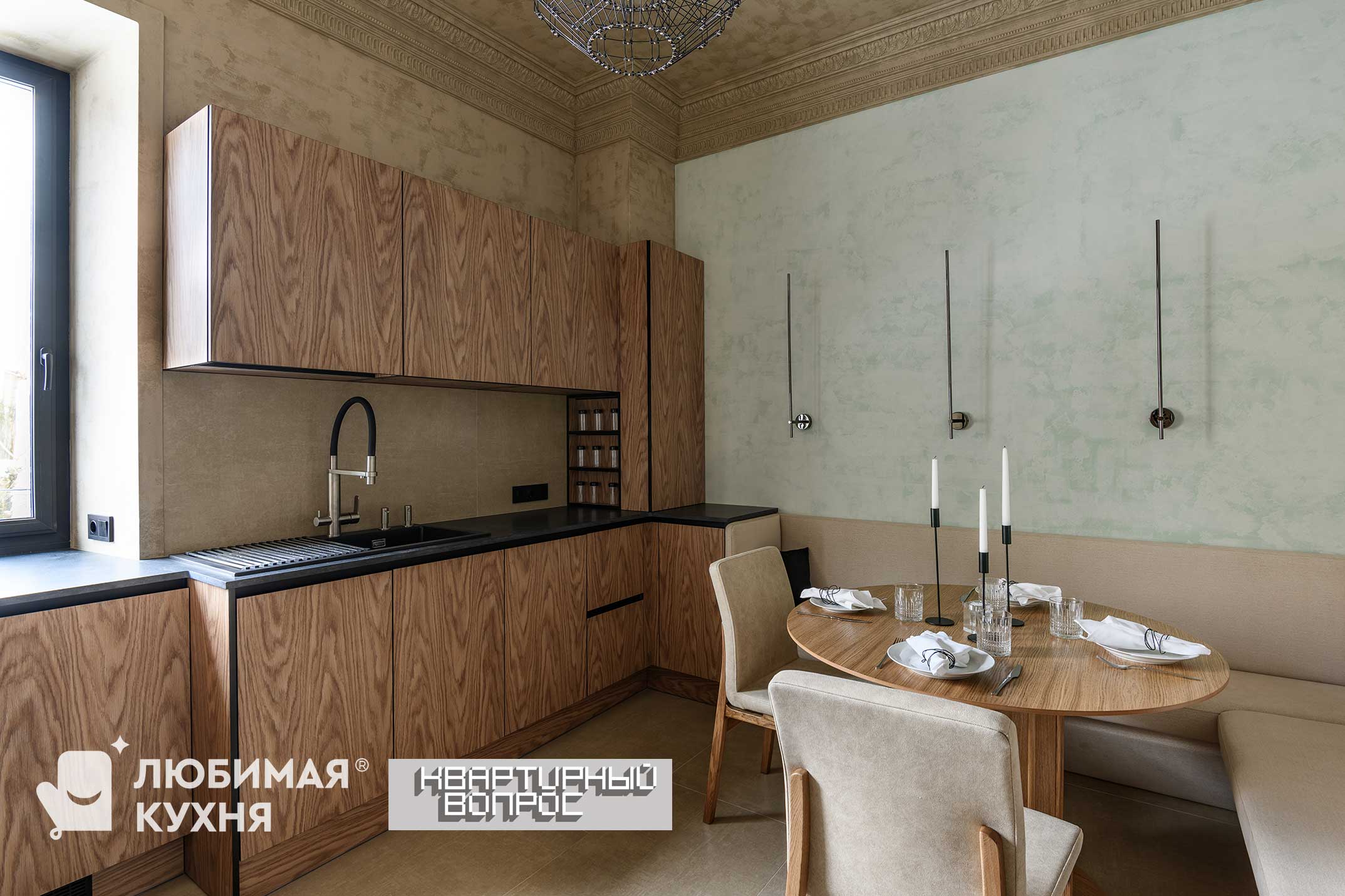Корпуса стандартной глубины – 60 см – выстроились в ряд до угла, при этом в корпуса интегрировали алюминиевые ручки-профили. Все ящики и дверцы в нашем проекте на доводчиках, работают плавно. Здесь предусмотрели внушительное количество мест хранения.