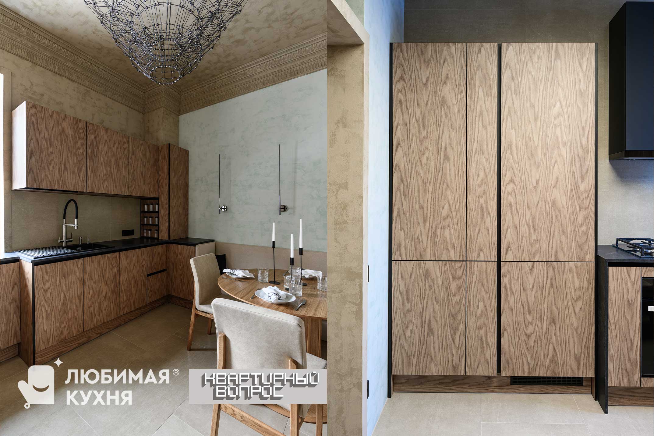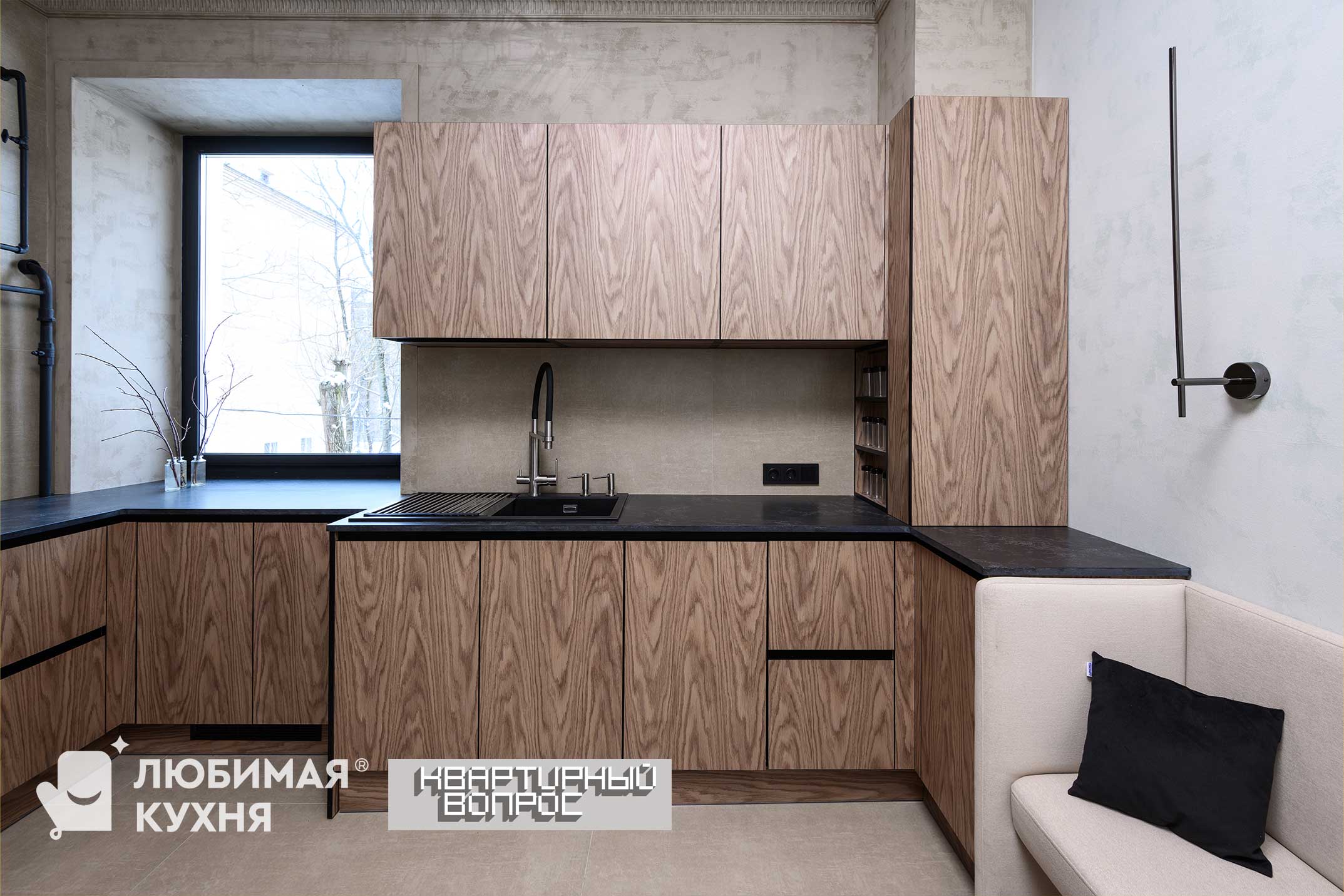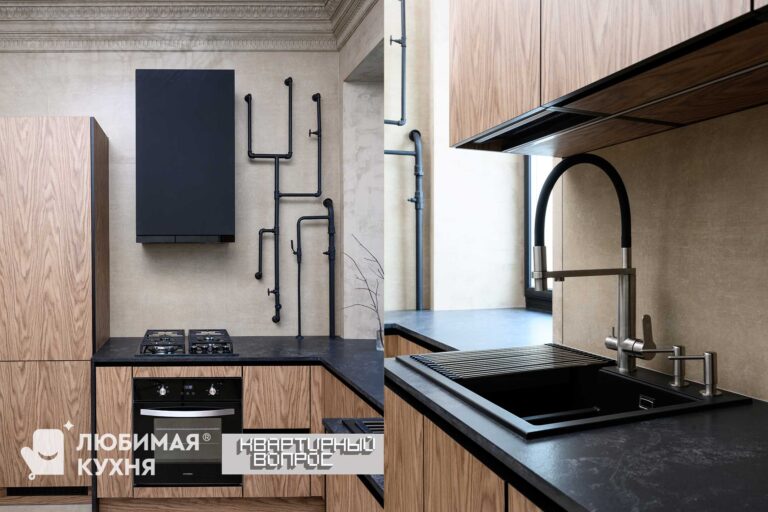Корпуса и фасады кухонного гарнитура выполнены из ЛДСП Ламарти в декоре «Медея». Пластиковая кромка контрастная, чёрная. Между широких шкафов в нише устроился пенал с ящиками полного выдвижения для домашней бакалеи. Хозяйский радиатор скрыли узким модулем с полками.