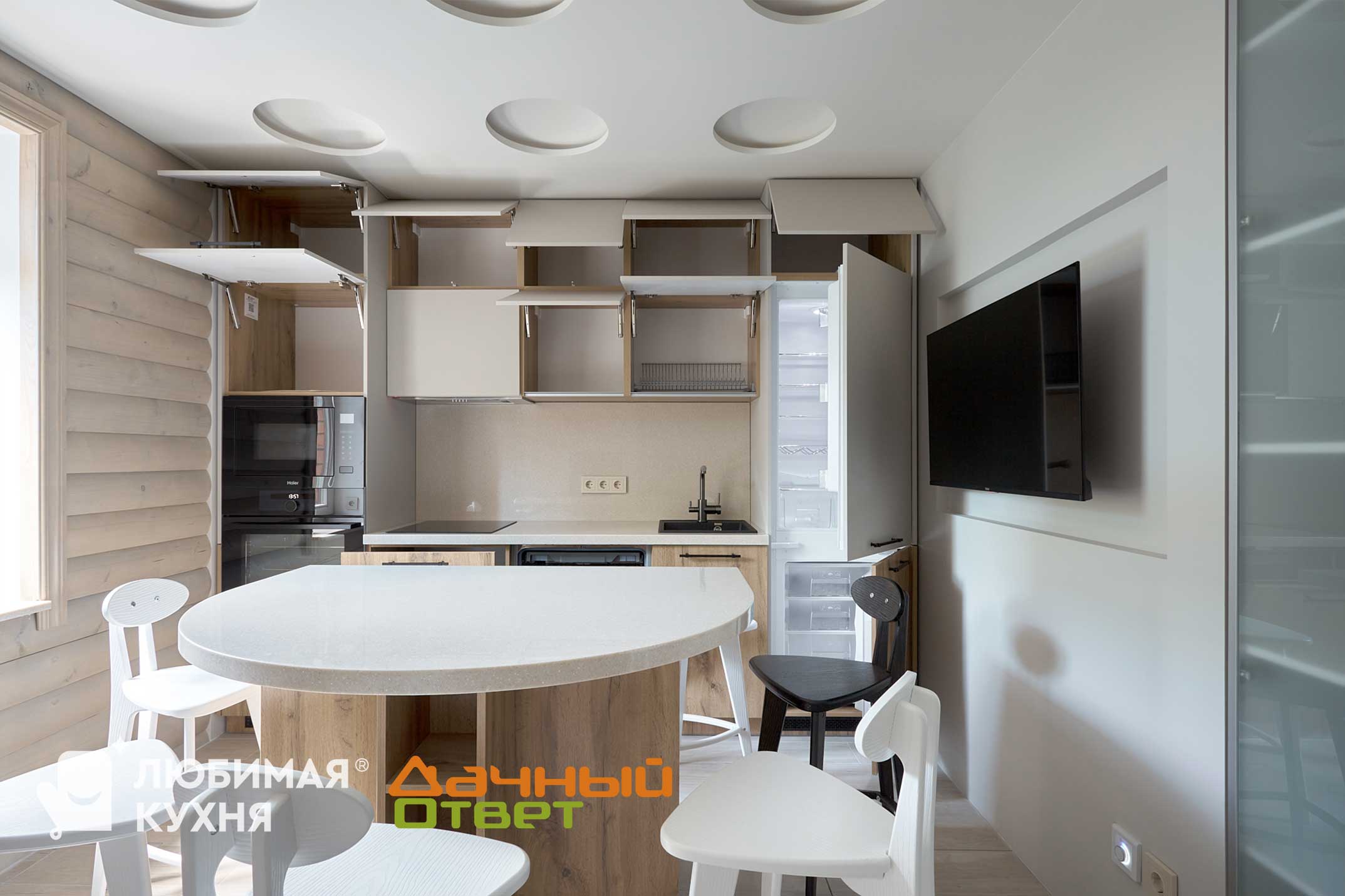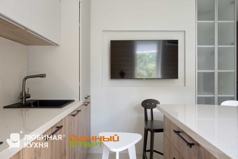 Корпус из ЛДСП в двух цветах – белом и под дерево. Ящики и шкафы выстроились в два плотных ряда, так что мест для хранения у наших героев теперь много. Фурнитура австрийская, качественная. С такой дверцы хлопать не будут, и работают плавно и бесшумно.