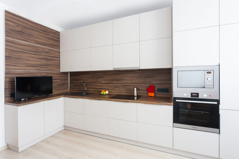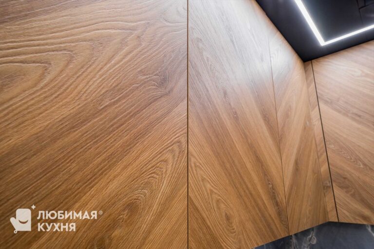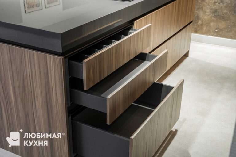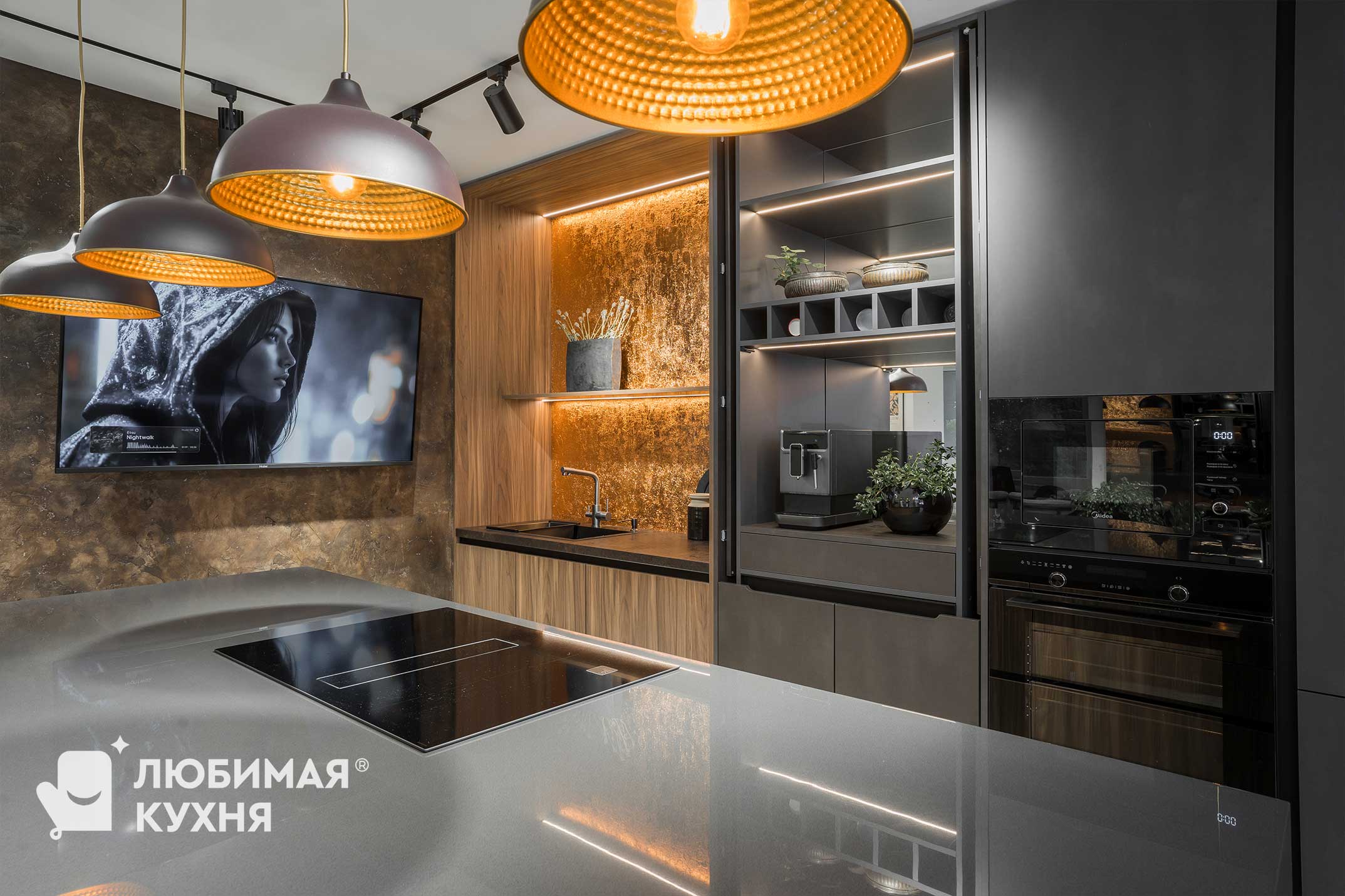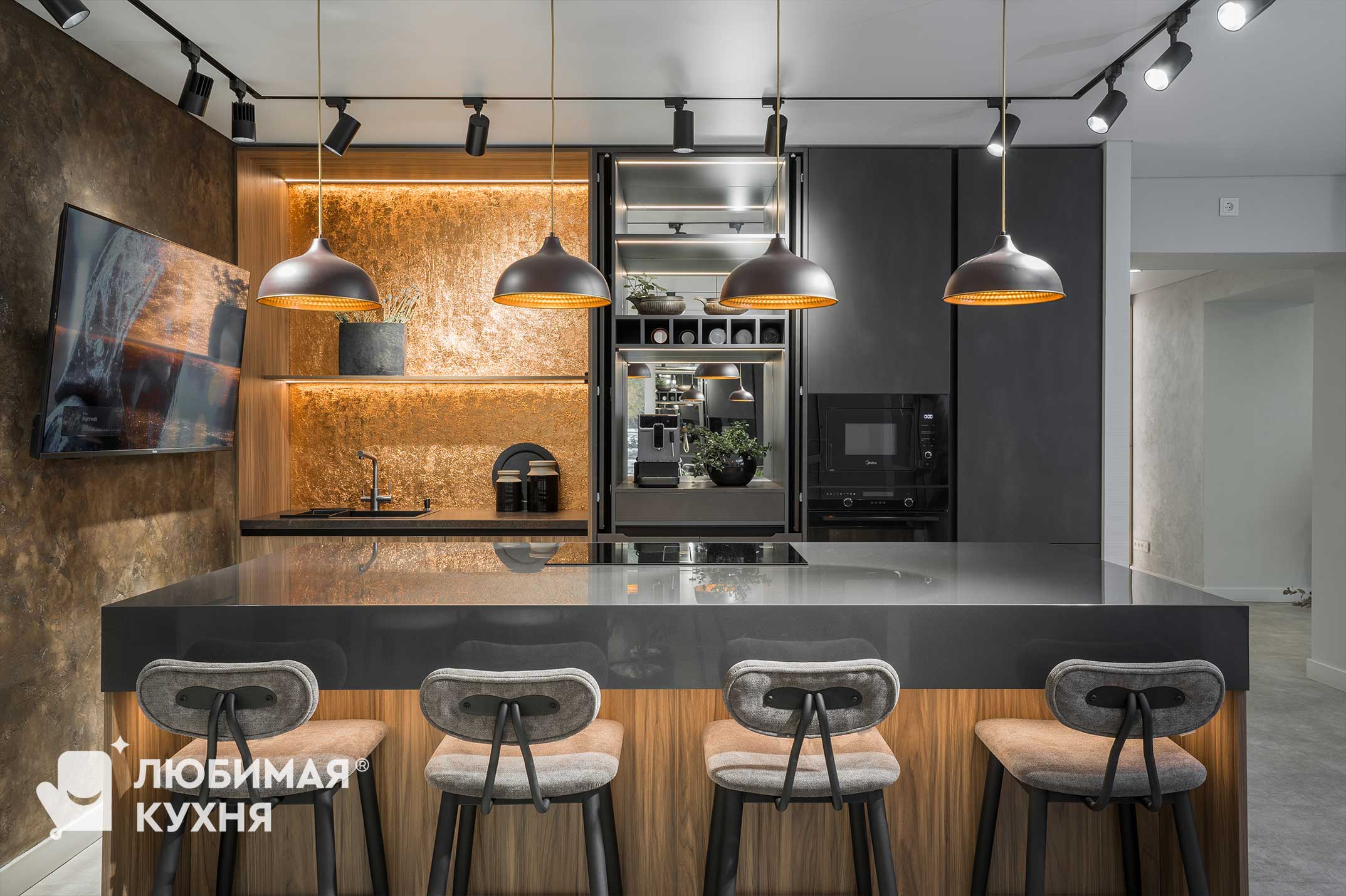 Шикарная кухня для ценителей сложных текстур, цветовых сочетаний и внимательных к деталям. Небольшая зона с мойкой, совмещенная с невероятно вместительными пеналами, в которых разместились полки для хранения различной утвари, от кофемашины, до столовых приборов и колонны со встроенной техникой. Композицию завершает большой и вместительный остров, с одной стороны которого предусмотрена зона готовки с варочной панелью, а с другой зона приема пищи и отдыха.