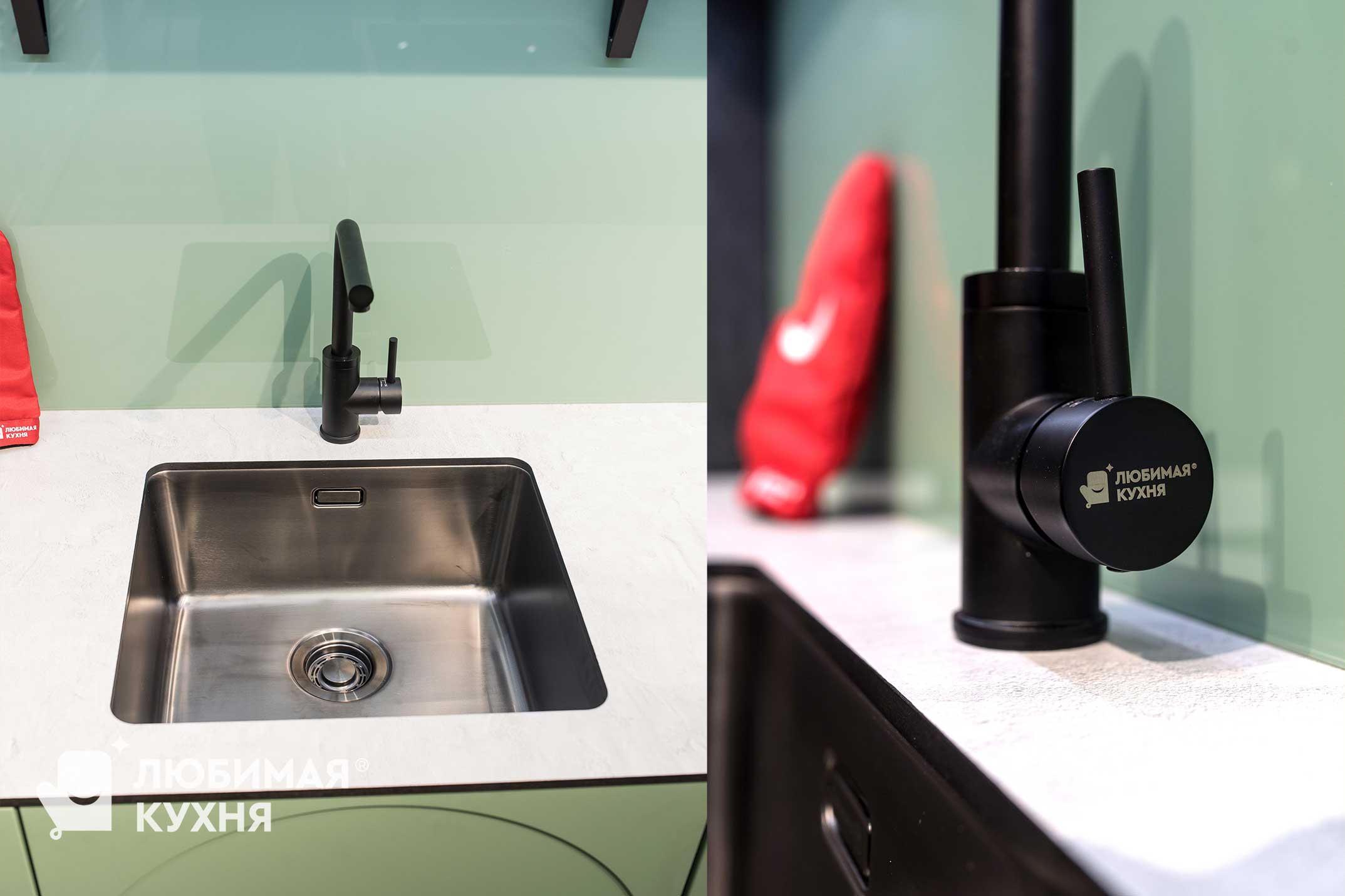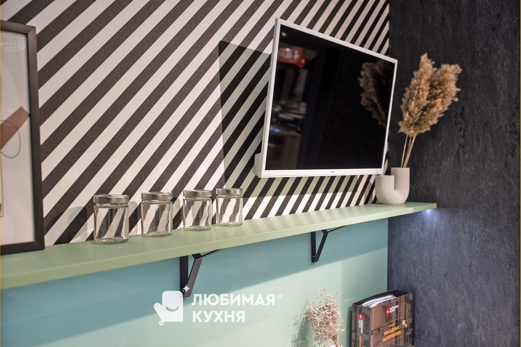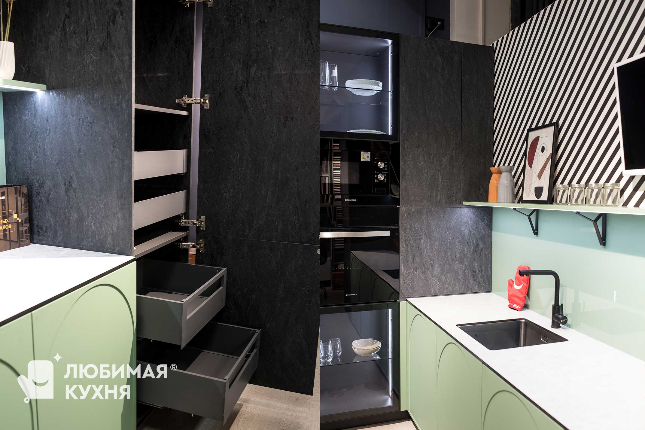 Яркое сочетание зелёных фасадов и полосатого акцента. Да, здесь можно позволить себе украсить зону открытого хранения, ведь весь функционал собран в чёрном вместительном пенале. А что бы расширить рабочую зону, здесь представлен удобный остров. Особая гордость — наша фирменная дизайнерская фрезеровка мемфис удобная в уборке и очень красивая.