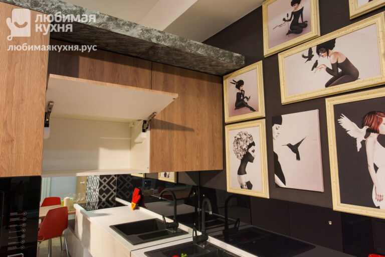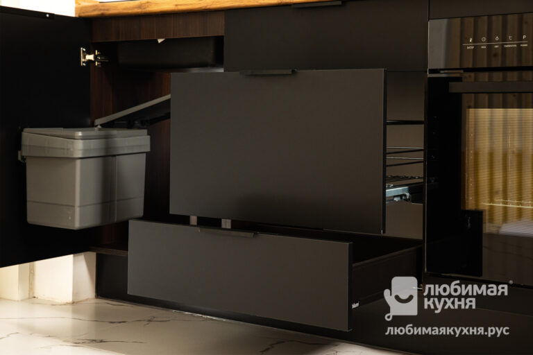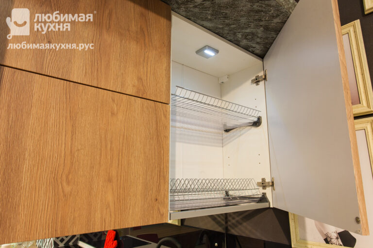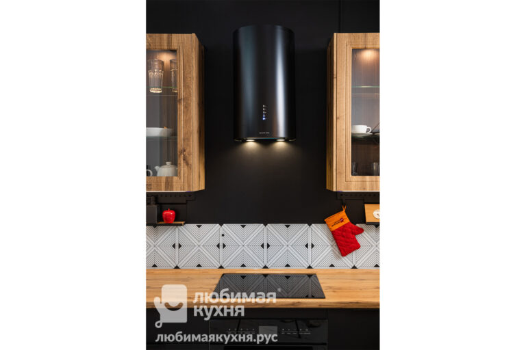 Строгость в сочетании с нотками мягкости и теплоты воплощена в данной модели. Насыщенно темные фасады с теплой древесной структурой выдержаны в модном стиле лофт в сочетании с контрастной геометричной стеновой панелью складываются в единую композицию.