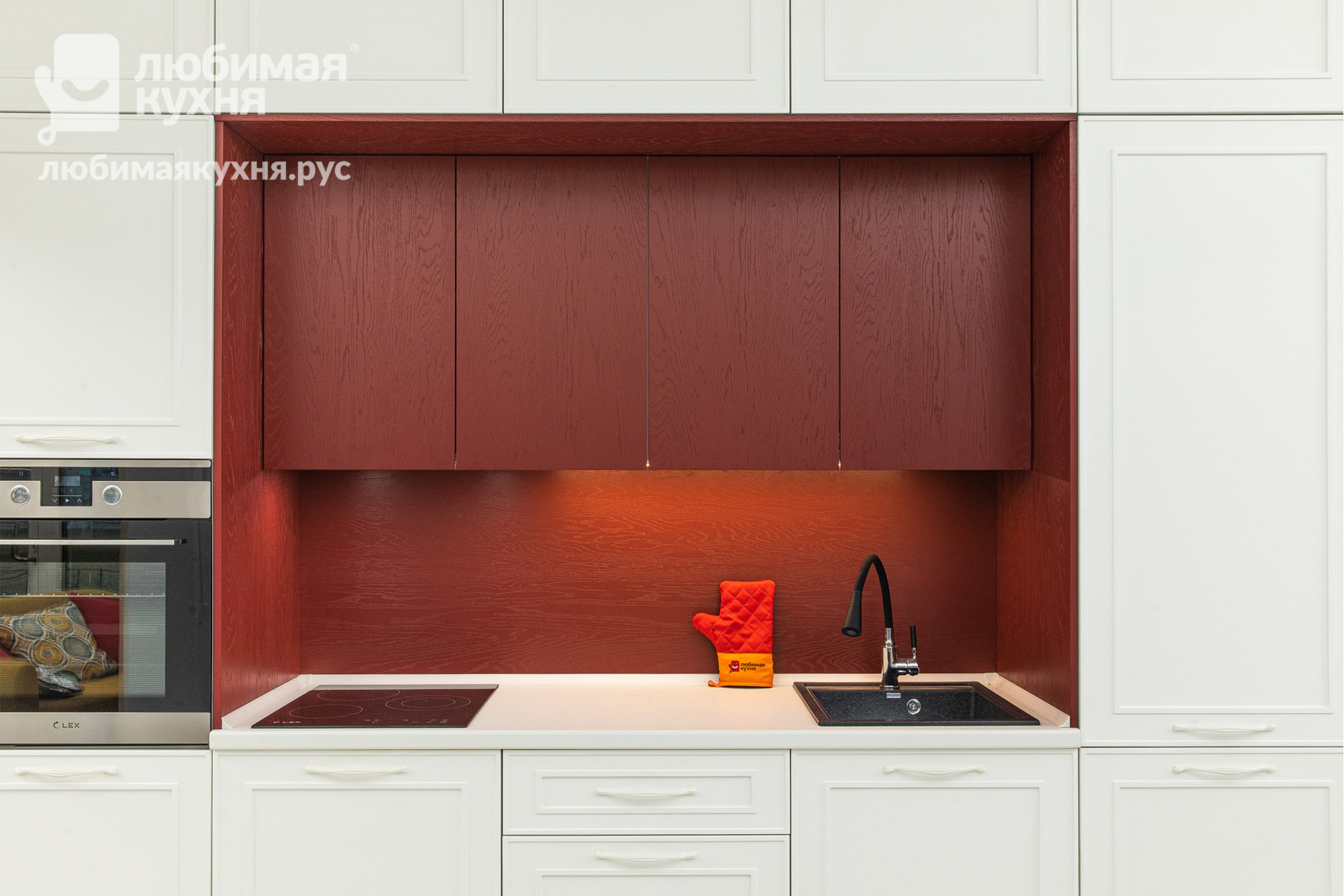Супер современная и минималистичная кухня с ярким акцентом. Графичные рамки фасадов смягчаются необычными ручками и красным фартуком.