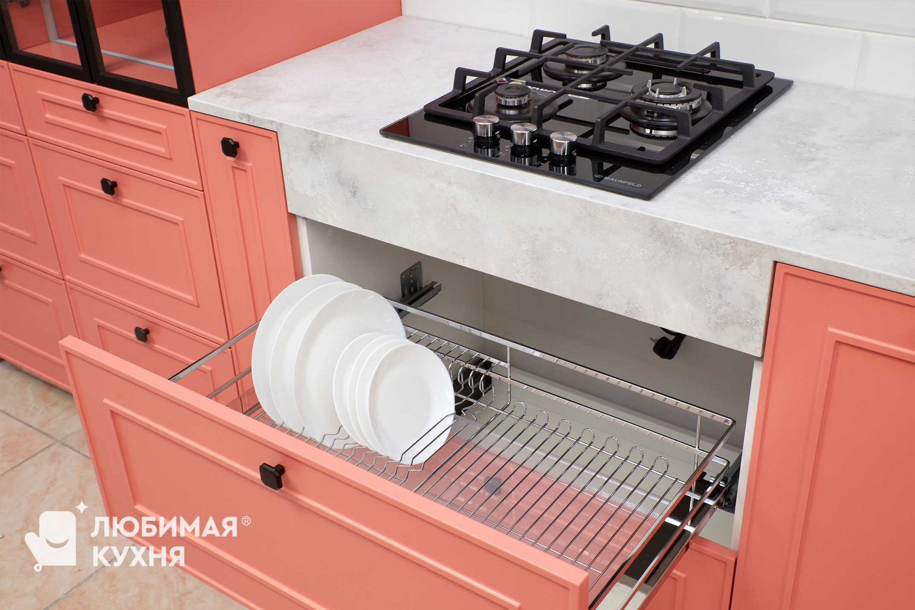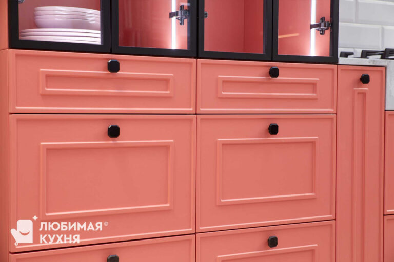 Если у вас много красивой посуды, то тренд этого года, шкафы-витрины на тонкой металлической раме вам придется по душе!Сладкий коралловый цвет, классическая фрезеровка, черные акценты, современное наполнение и необычная вытяжка делают нашу новинку «Сардена» и нежной, и яркой, и дерзкой!