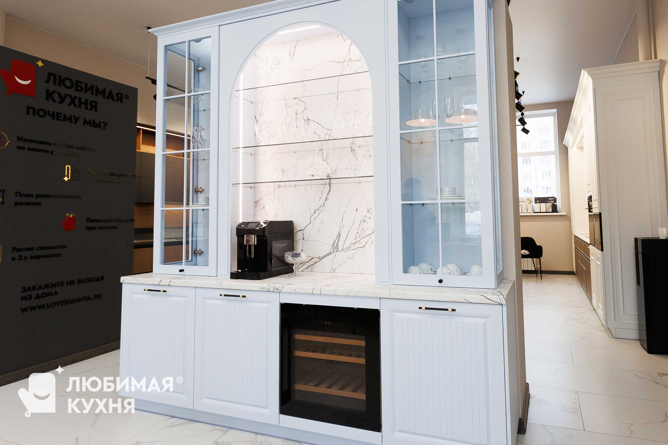 Элегантная кухня в классическом стиле с фасадами нежно-голубого оттенка. Центральная композиция выделяется арка с мраморным фартуком, встроенной стеклянной полкой для бокалов и подсветкой. Симметричные витрины с решётчатыми фасадами по бокам создают ощущение лёгкости. Нижний ряд дополнен винным шкафом и фактурными филенчатыми дверцами с бронзовой фурнитурой. Столешница и напольная плитка из мрамора поддерживают монохромную гамму, а чёрные трековые светильники добавляют современный акцент.