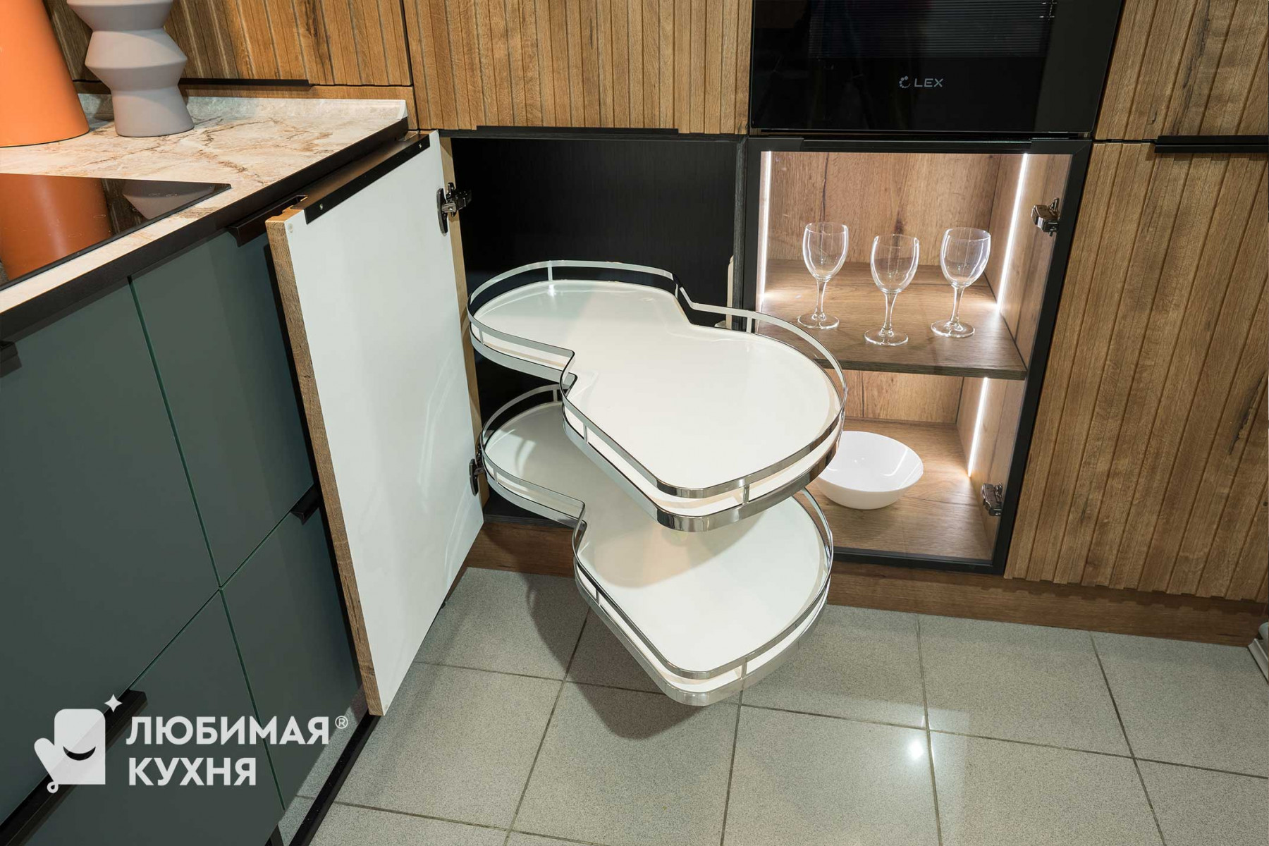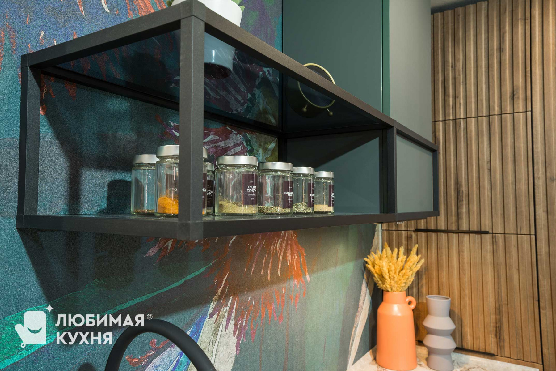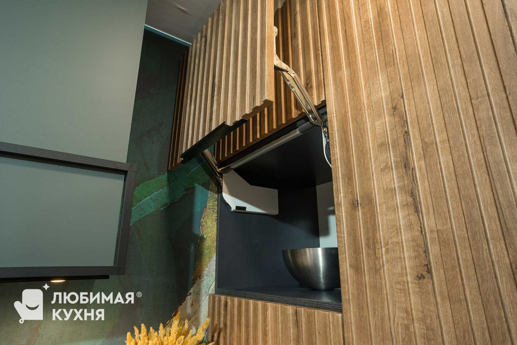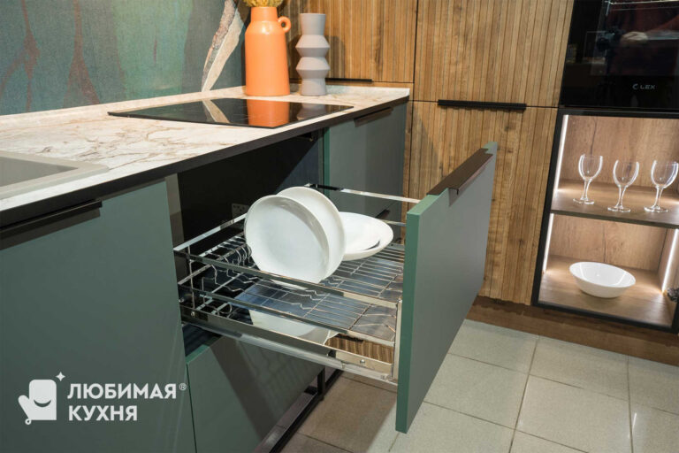 коллекция Ultramat , цвет Форест грин 3027, пеналы: МДФ в термопластике цвет Срез Дуба тёмный, фрезеровка Альберо, стёкла в алюминиевой чёрной раме, цвет графит