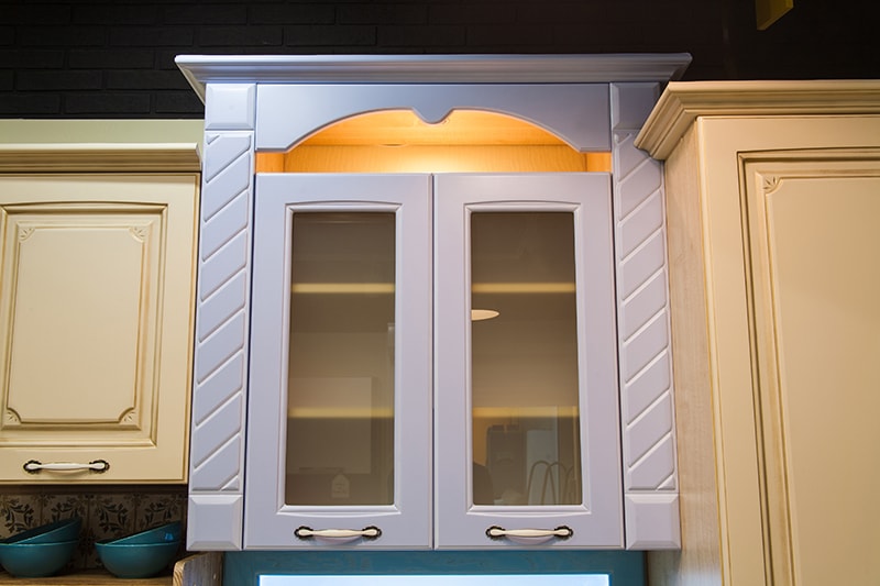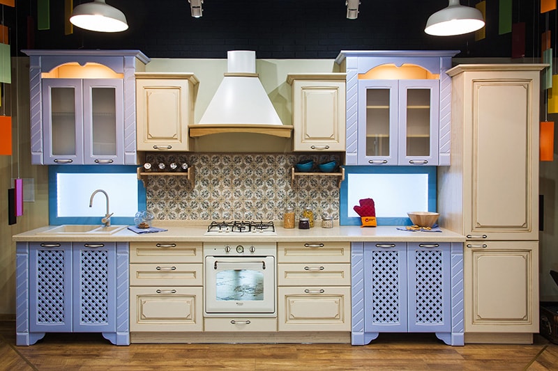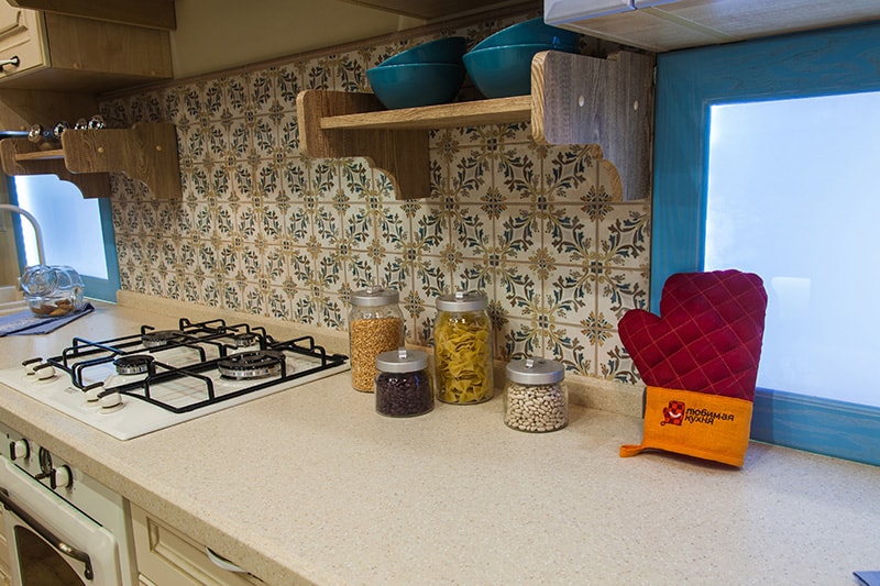 Нежная кухня, исполненная в бежевом и светло-голубом тонах придется по душе любой хозяйке. Бронзовые ручки, резные дверцы шкафчиков и их изящная форма придают гарнитуру легкость и воздушность.