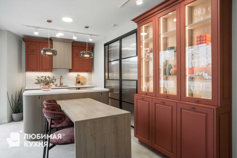 Данная кухня прекрасно подойдет для загородного дома, ведь ее компоновка включает остров, стол и нарядный буфет. Она просто создана для уютных, теплых вечеров с бокалом глинтвейна, большой семьи или для романтичного вечера на двоих.