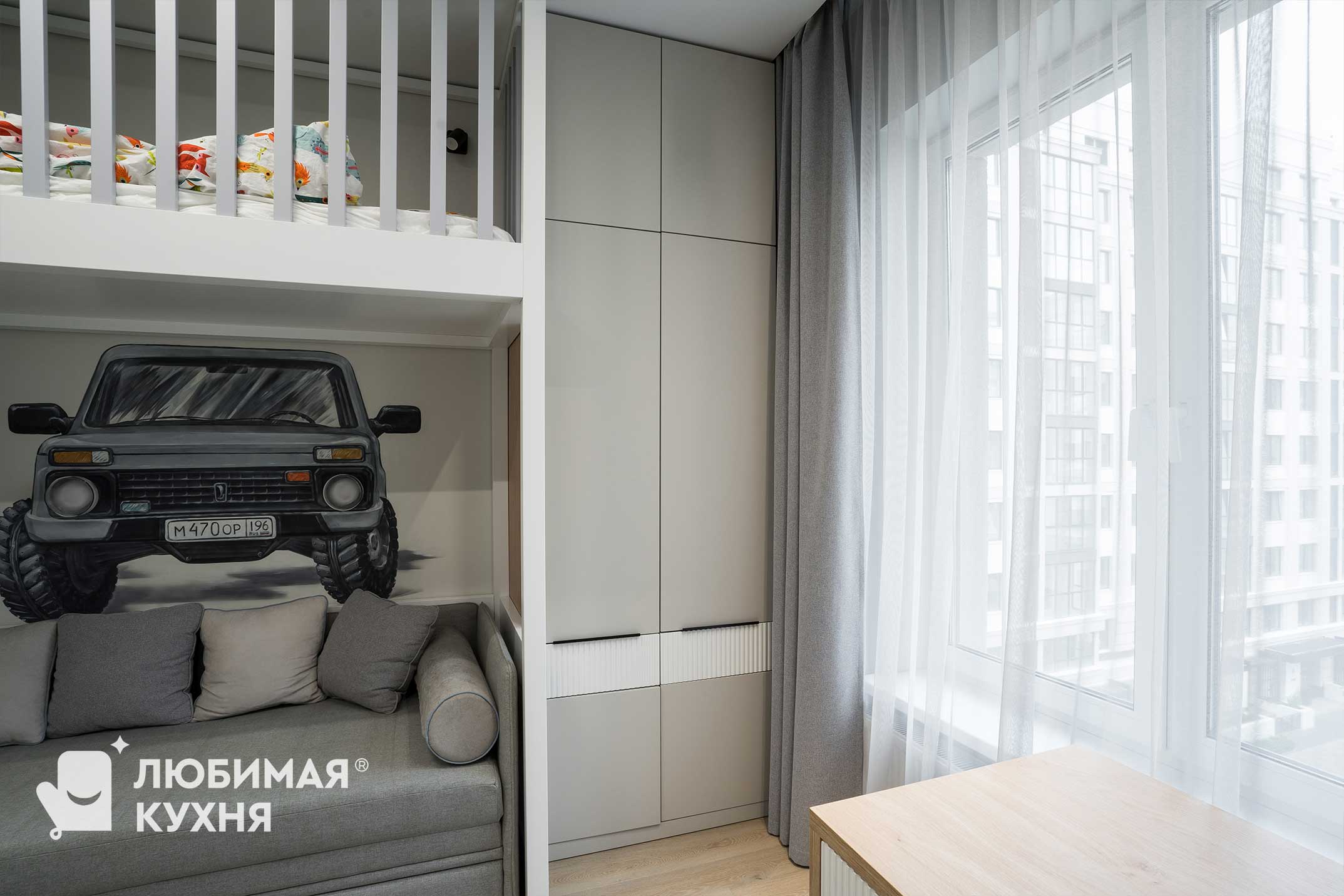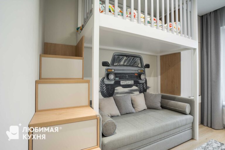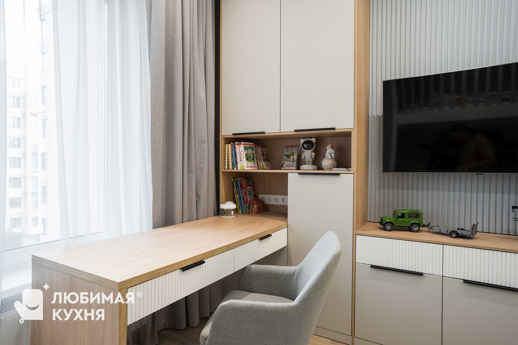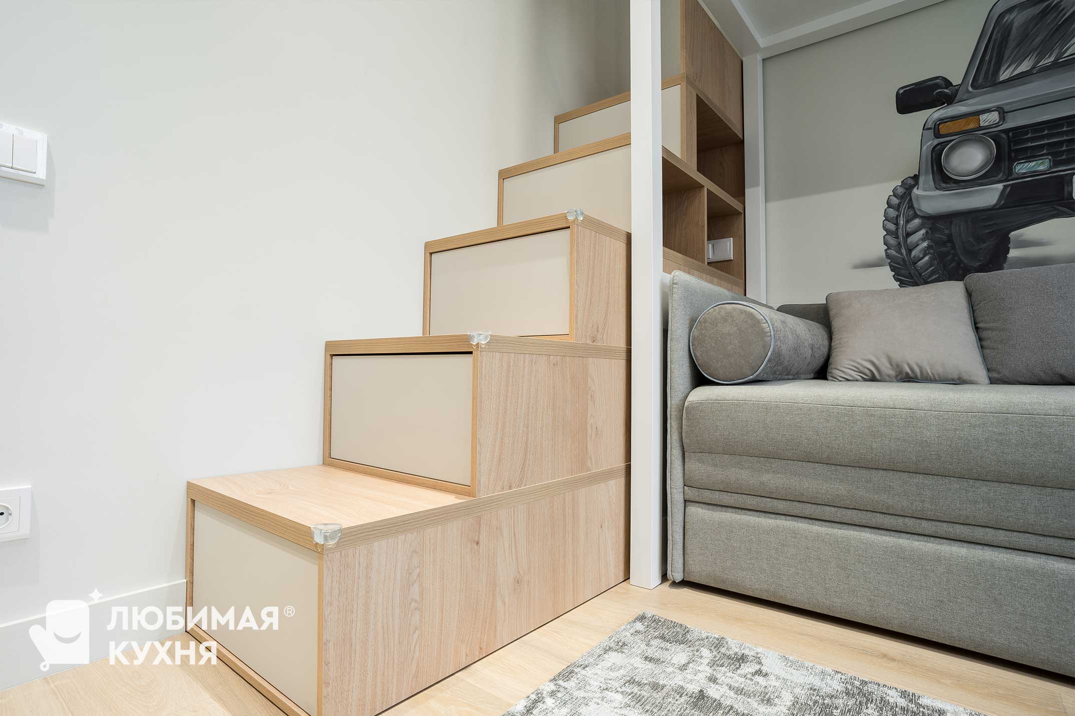 Современная детская комната с минималистичным дизайном для мальчика. Стол из светлого дерева и имеет гладкую поверхность. Вдоль стены расположен встроенный шкаф в коричнево-бежевых тонах, которые обеспечивают дополнительное пространство для хранения вещей книг и игрушек. Над столом расположены полки, что позволяет удобно задействовать пространство возле стола. В комнате продумано много мест для хранения, по бокам от кровати расположился шкаф для одежды, лестница так же оснащена выдвижными ящиками для хранения.