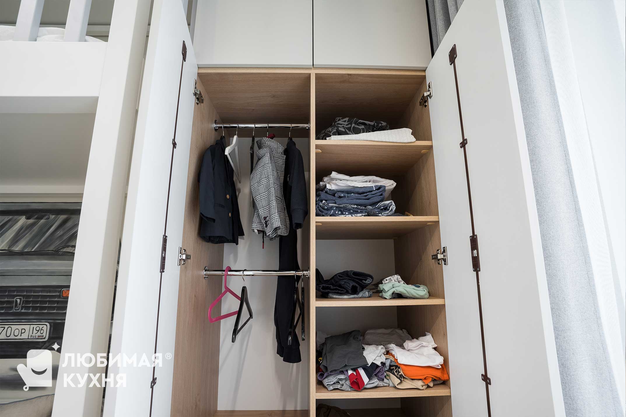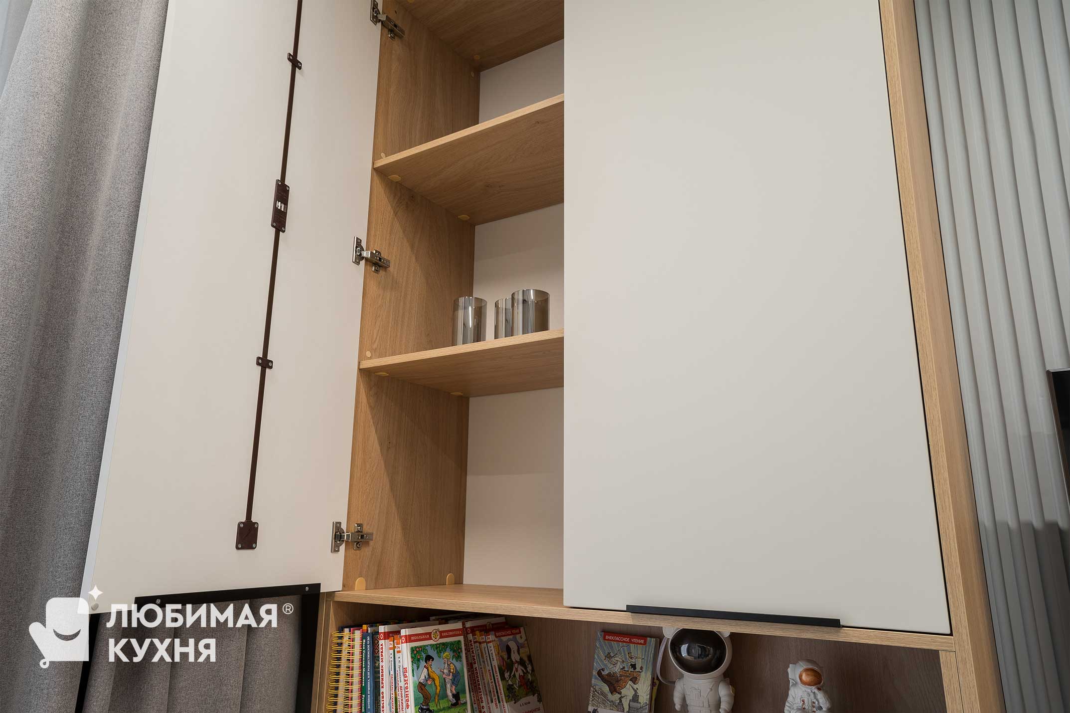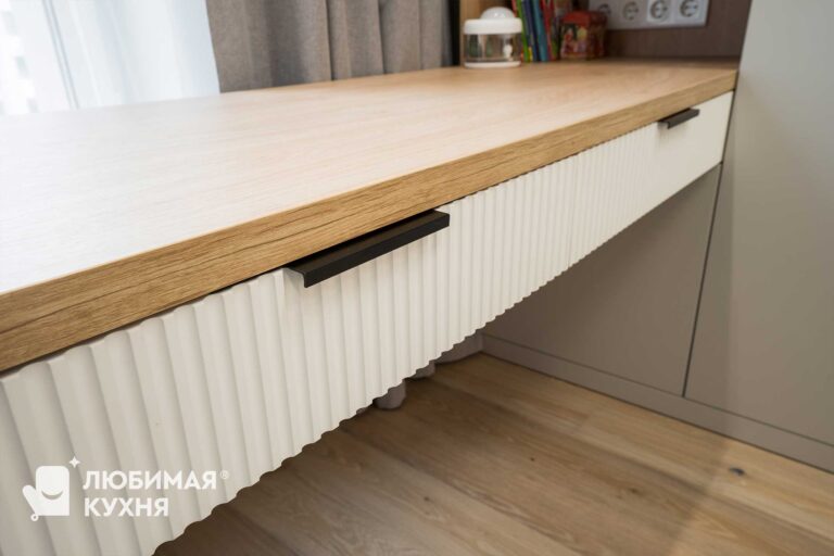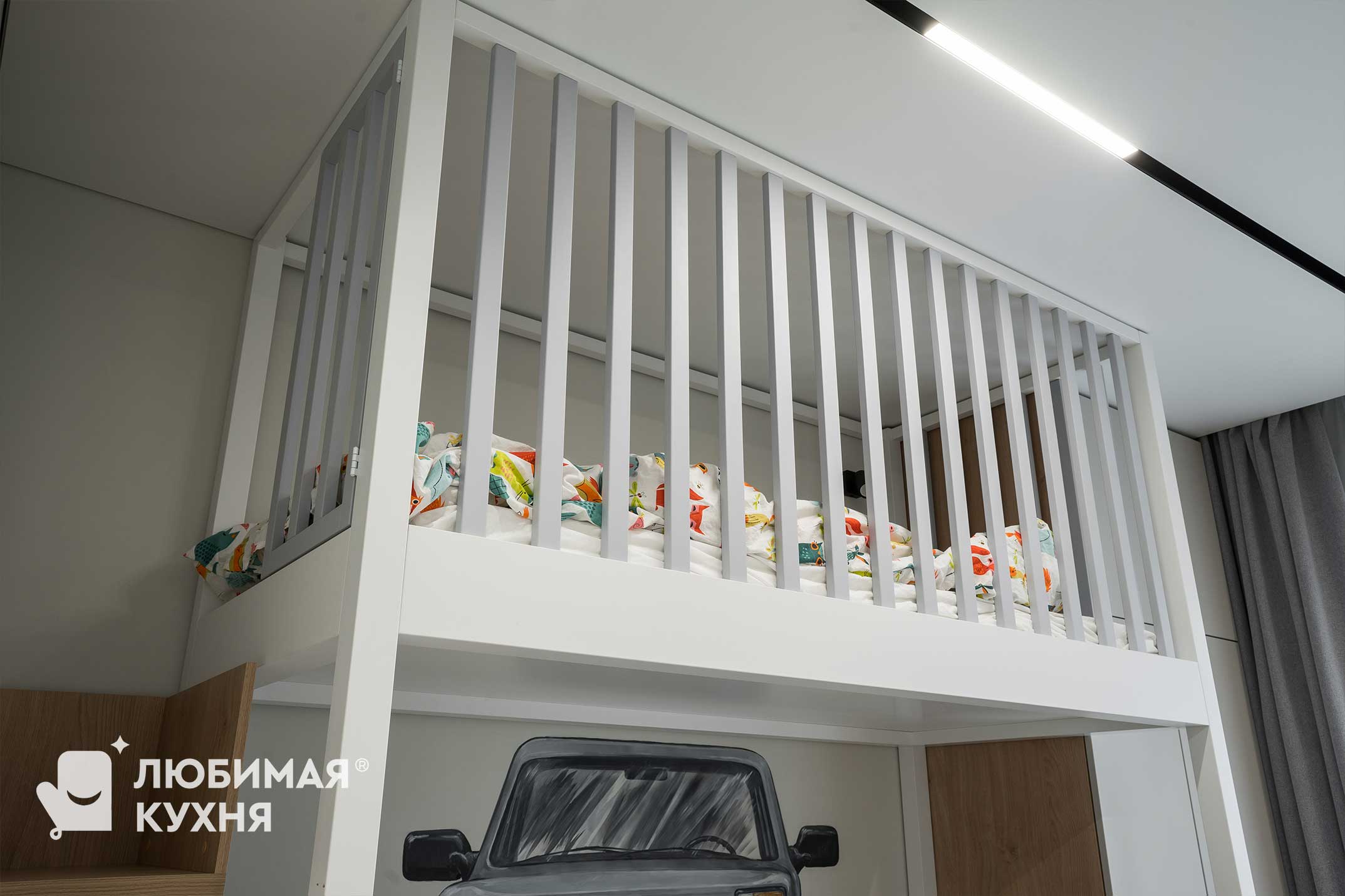 Современная детская комната с минималистичным дизайном для мальчика. Стол из светлого дерева и имеет гладкую поверхность. Вдоль стены расположен встроенный шкаф в коричнево-бежевых тонах, которые обеспечивают дополнительное пространство для хранения вещей книг и игрушек. Над столом расположены полки, что позволяет удобно задействовать пространство возле стола. В комнате продумано много мест для хранения, по бокам от кровати расположился шкаф для одежды, лестница так же оснащена выдвижными ящиками для хранения.