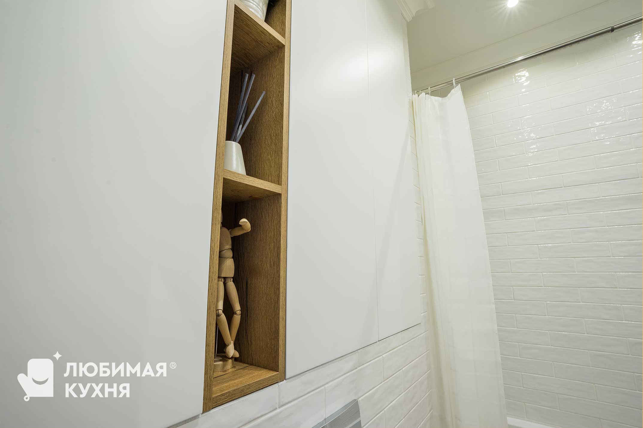 На изображении представлен современный и стильный санузел в скандинавском стиле. Тумба под раковину выполнена в благородном сером оттенке в сочетании с древесной столешницей, что придает интерьеру теплоту и уют. Над унитазом расположился шкафчик, который практически растворился в пространстве, а полочки с древесной текстурой выполняют роль акцента и перекликаются со столешницей под раковиной и оттенком пола.
