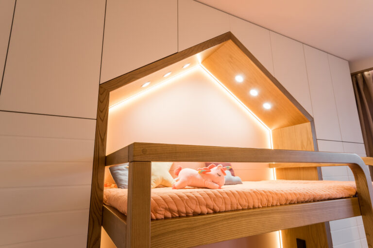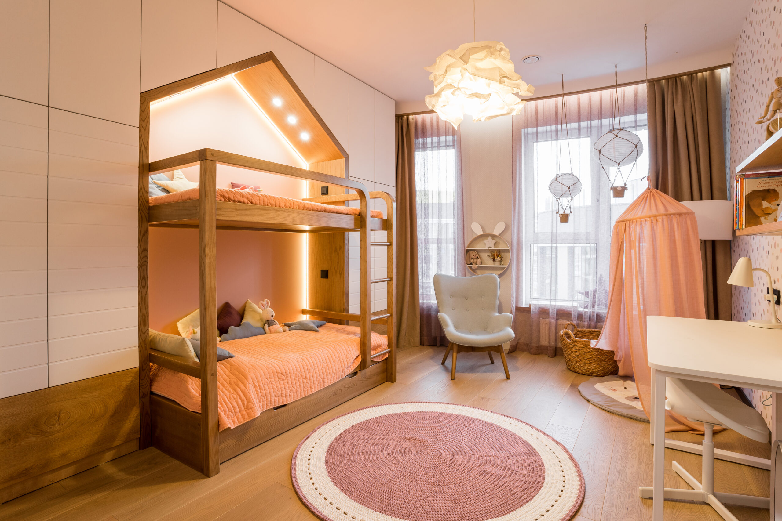 Детская комната в скандинавском стиле. Стены оформлены встроенными супер вместительными шкафами, в которые интрегрирована двухъярусная кровать с подсветкой. Детская в светлодревесных оттенках — идеально сочетание что бы не перегружать детскую психику, способствовать отдыху и создать уютное детское гнездышко.