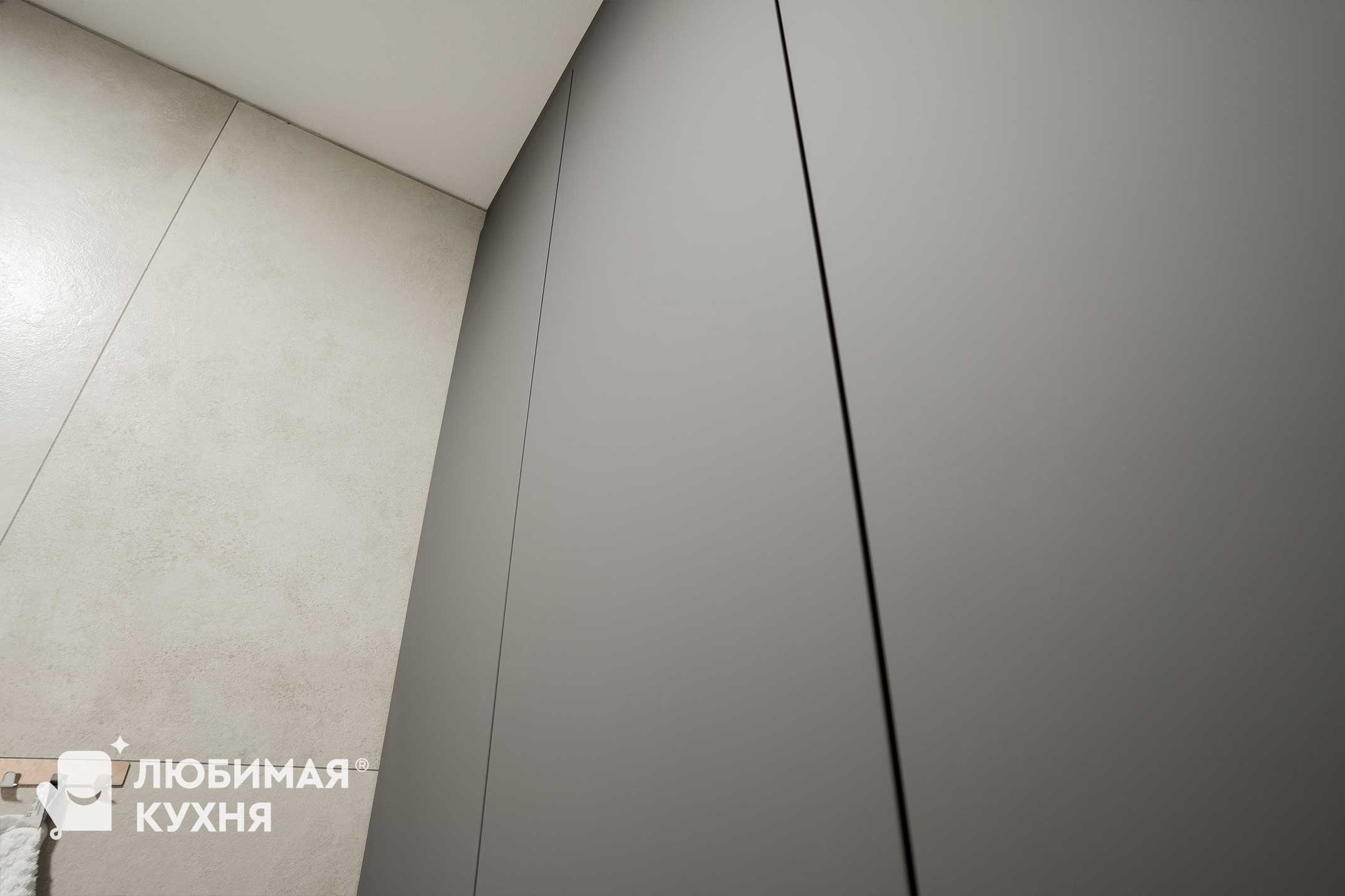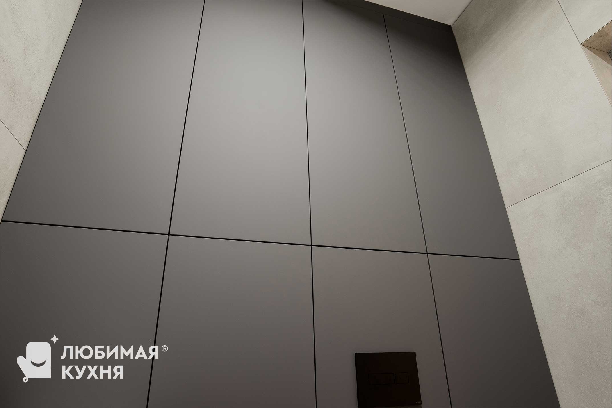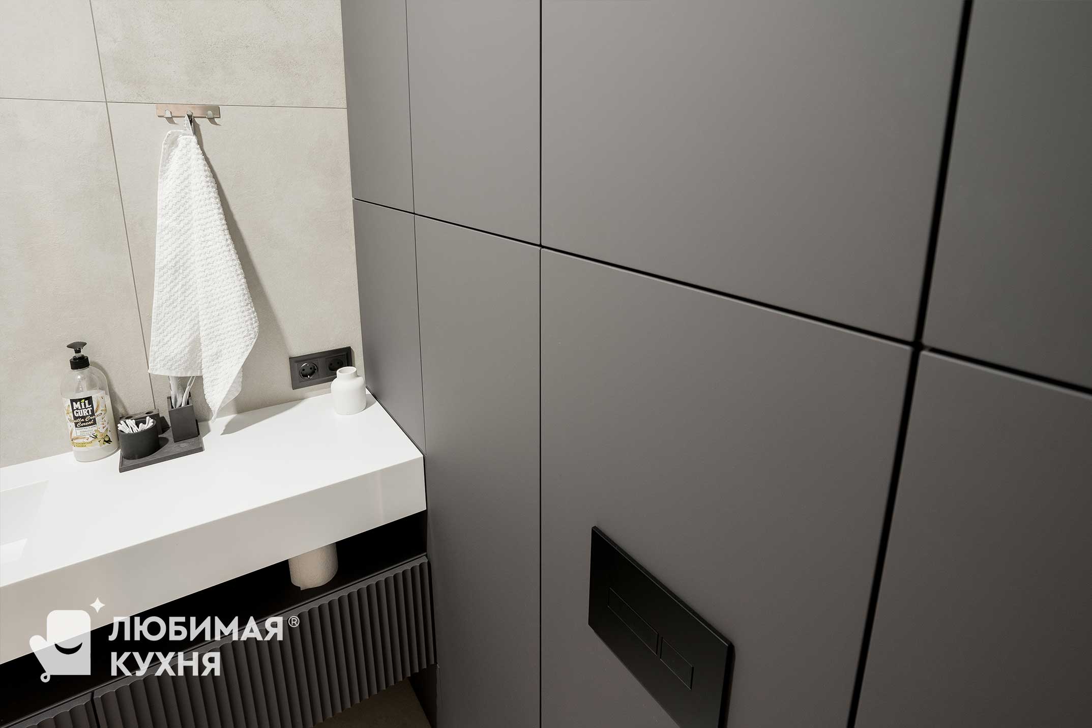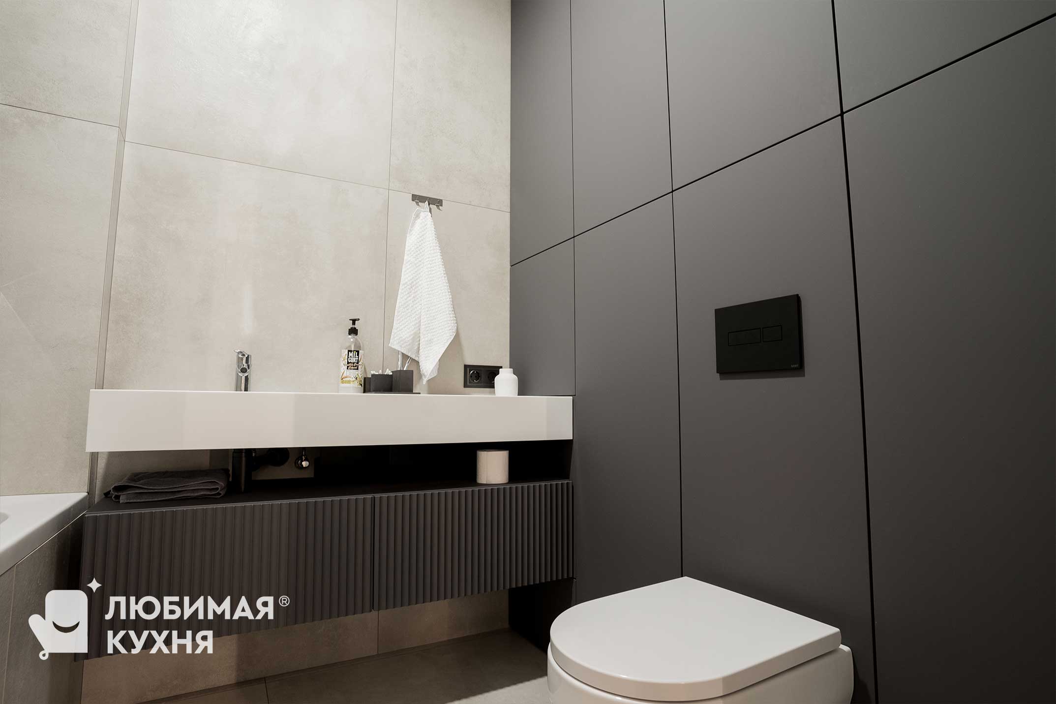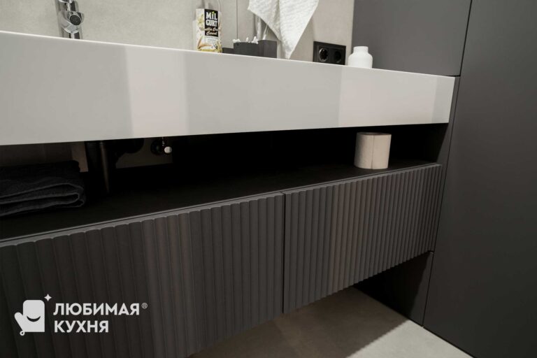 Надежная раковина с тумбой выполнена в минималистичном стиле с гладкой белой поверхностью. Рифленый фасад тумбы добавляет текстуру и интересный визуальный акцент. На стене расположены встроенные шкафы в темных тонах, что создает эффект глубины и стиля. Высота шкафов обеспечивают достаточно места для хранения туалетных принадлежностей, сохраняя пространство чистым и организованным.