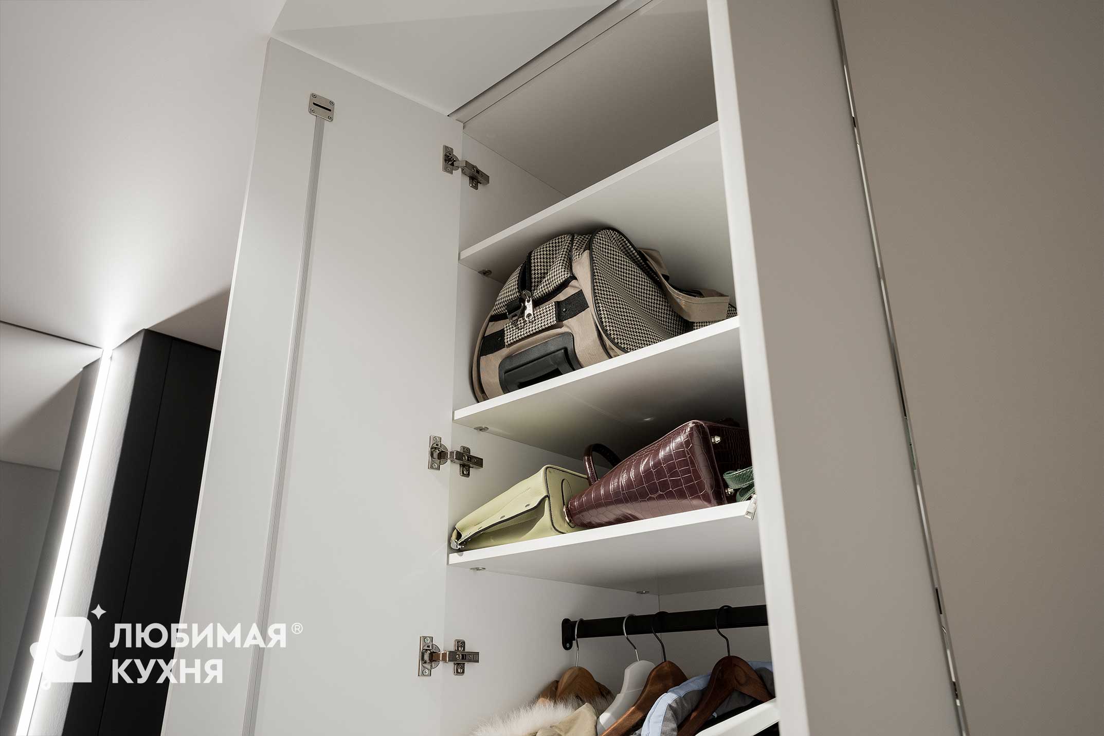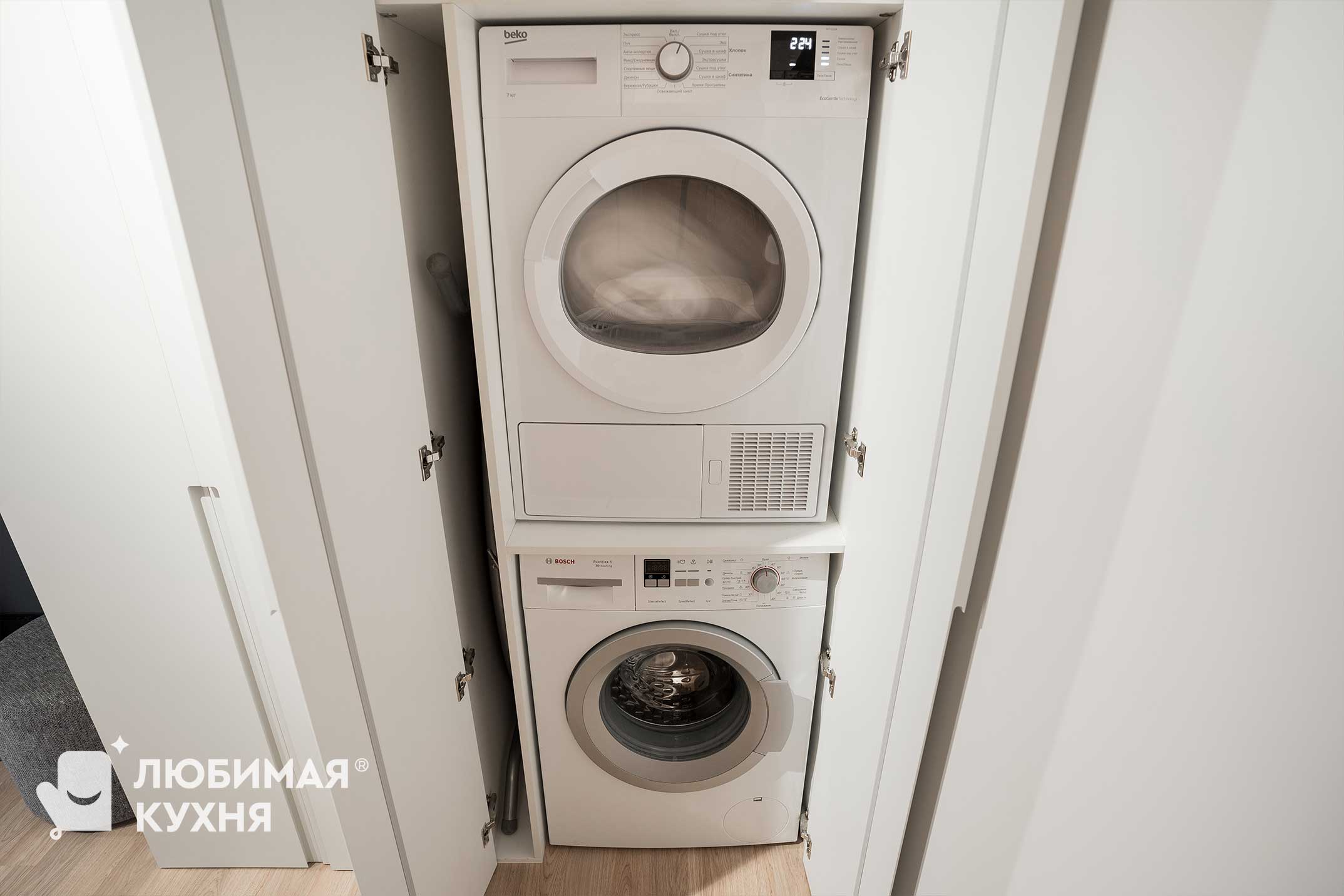Лаконичный шкаф в прихожую, который скроет то, что вы не хотите показывать. В шкаф прекрасно вписалась постирочная зона с сушильной и стиральной машинами, а так же отделение со штангой для длинных вещей. Фрезерованные ручки на фасадах выглядят невероятно стильно и подчеркивают минималистичность данного интерьера.