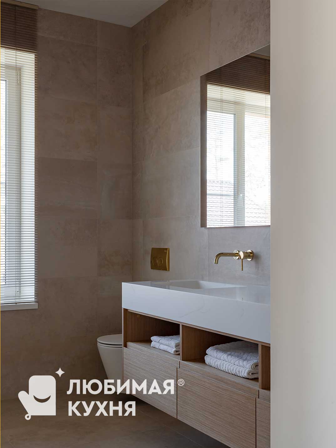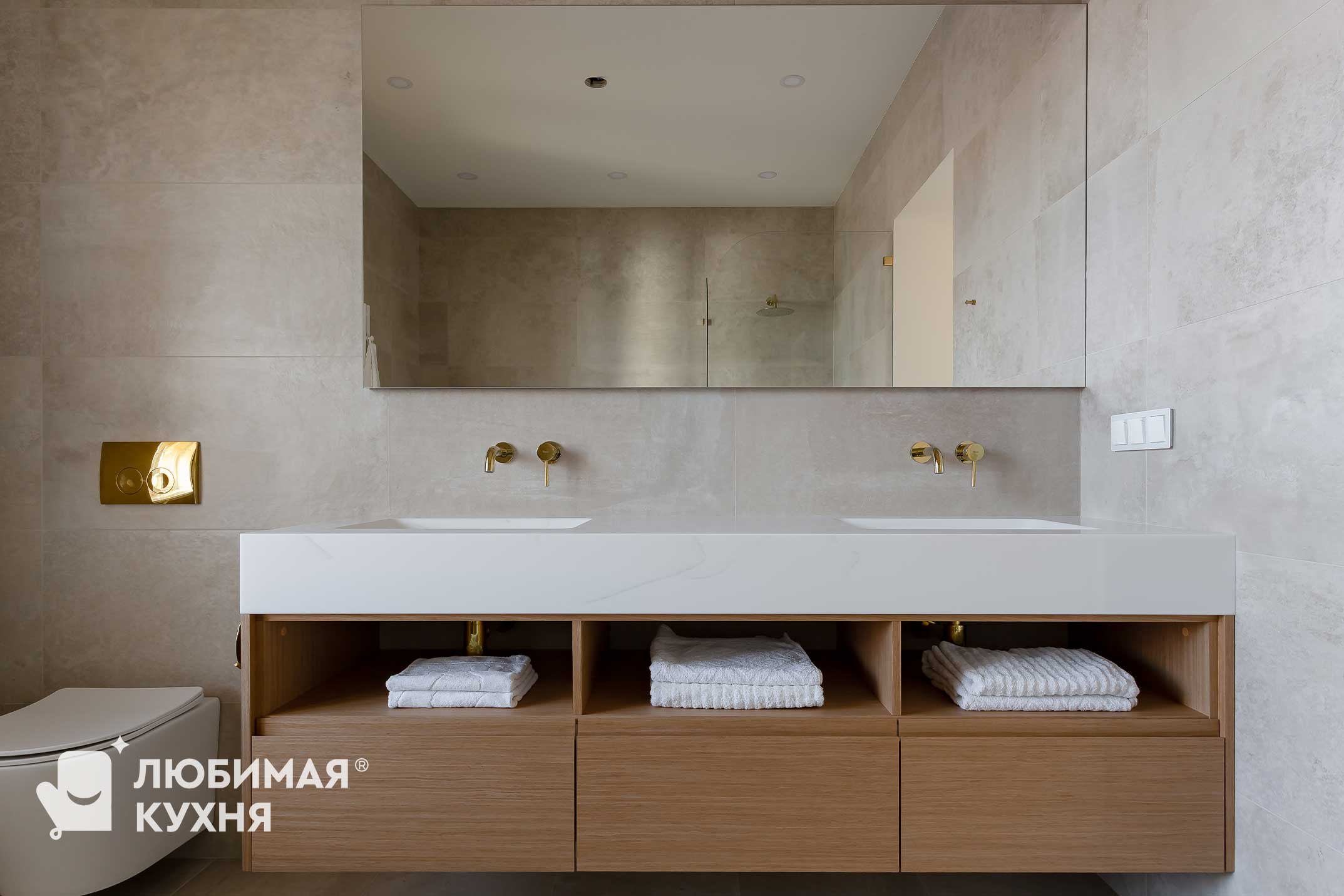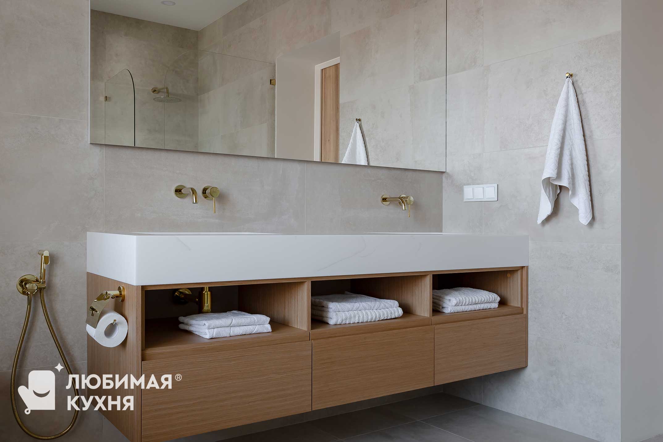 Тумба в этом санузле выполнена в современном стиле и сочетает в себе элегантность и функциональность. Тумба изготовлена из натурального шпона, что придает ей теплый и уютный вид. Верхняя часть выполнена из белого искусственного камня, который легко чистится и создает невероятный контраст с деревянными элементами, а золотистые ручки на ящиках добавляют изысканности и гармонично сочетаются с сантехникой. Лаконичные линии и минималистичный стиль делают тумбу визуально легкой. Открытые полки снизу обеспечивают удобный доступ к полотенцам и другим принадлежностям. В нижней части расположены выдвижные ящики, которые предлагают дополнительное пространство для хранения косметики и других мелочей.