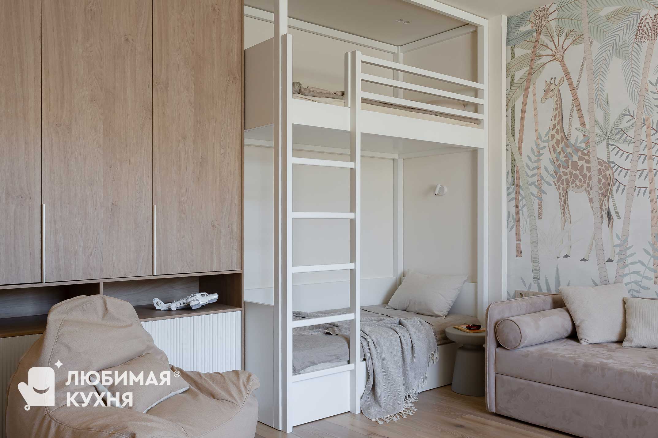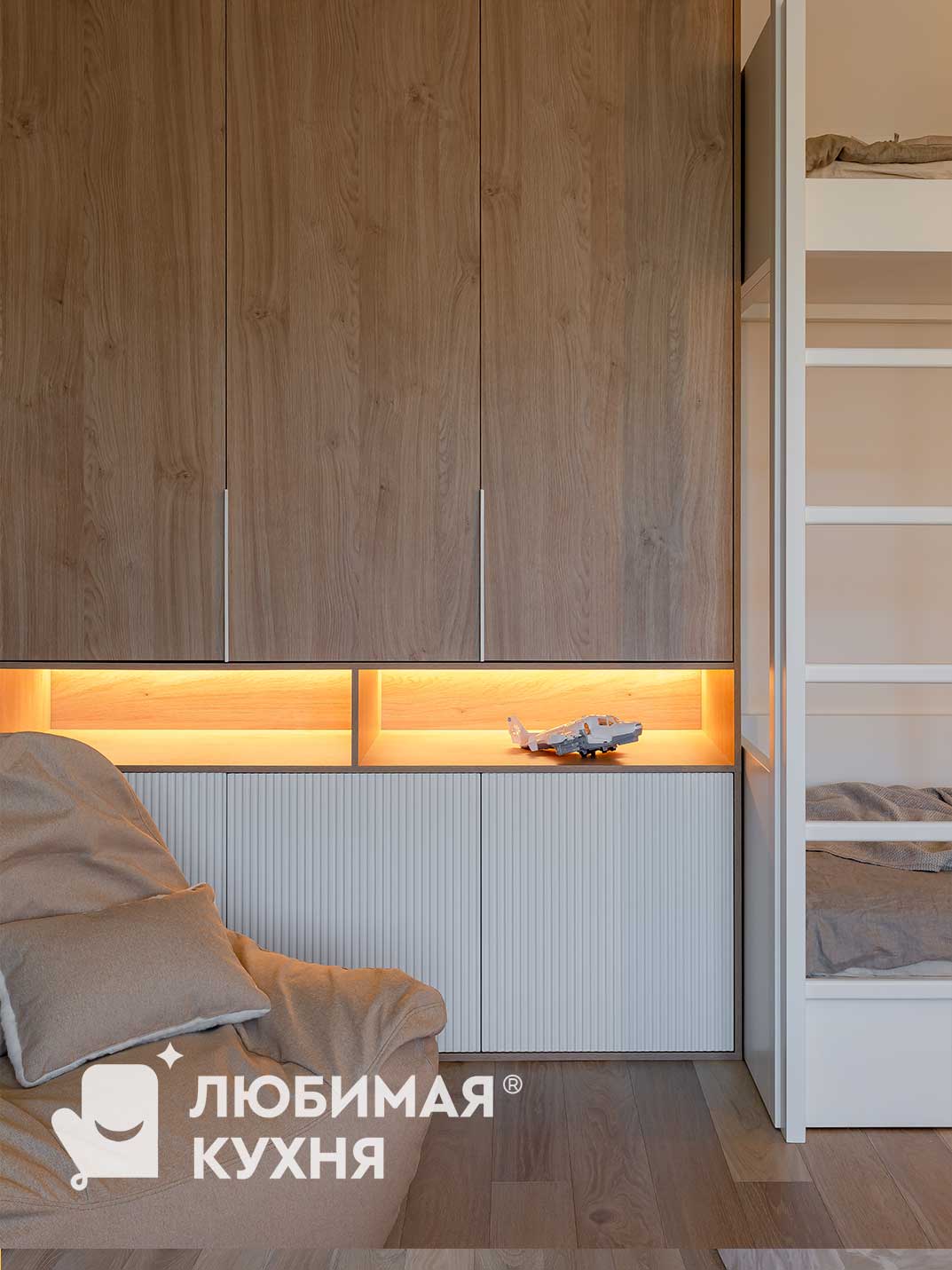 Детская комната — это прежде всего функциональность, нейтральные спокойные оттенки, безопасность и экологичность. Поэтому идеальным решением от “Любимой кухни” стал трехсекционный шкаф для одежды. Высота данного шкафа от пола до потолка обеспечивает хорошую вместительность и устойчивое положение. Рабочая зона представлена широкой столешницей с тумбой посередине и рассчитана на два детских посадочных места. Шкаф с открытыми полками поможет хранить книги каждому ребёнку по отдельности Вертикальная фрезеровка на фасадах шкафа и тумбы прекрасно гармонирует с нижними фасадами шкафа для одежды, и выделяет их из интерьера.