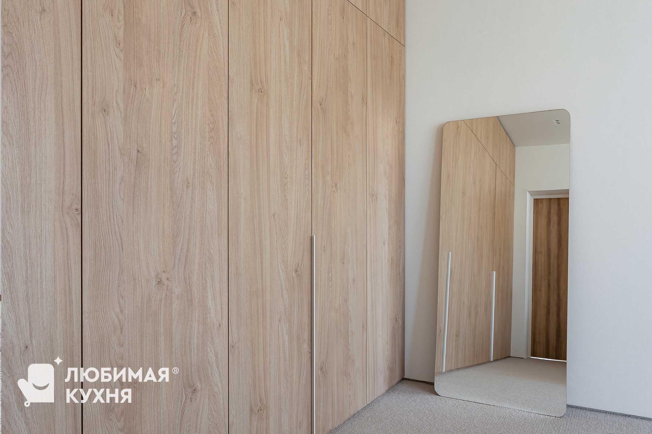 Шкаф в спальню в минималистичном стиле. Богатая древесная текстура создает мягкую, расслабляющую атмосферу. Прекрасное решение и альтернатива отдельной гардеробной, в такой шкаф поместиться примерно столько же вещей, как в небольшую гардеробную.