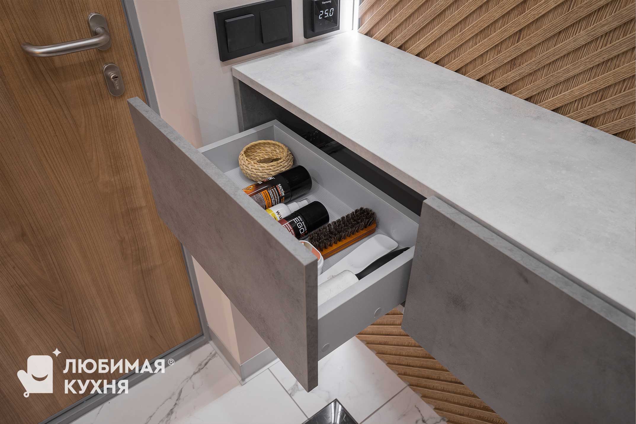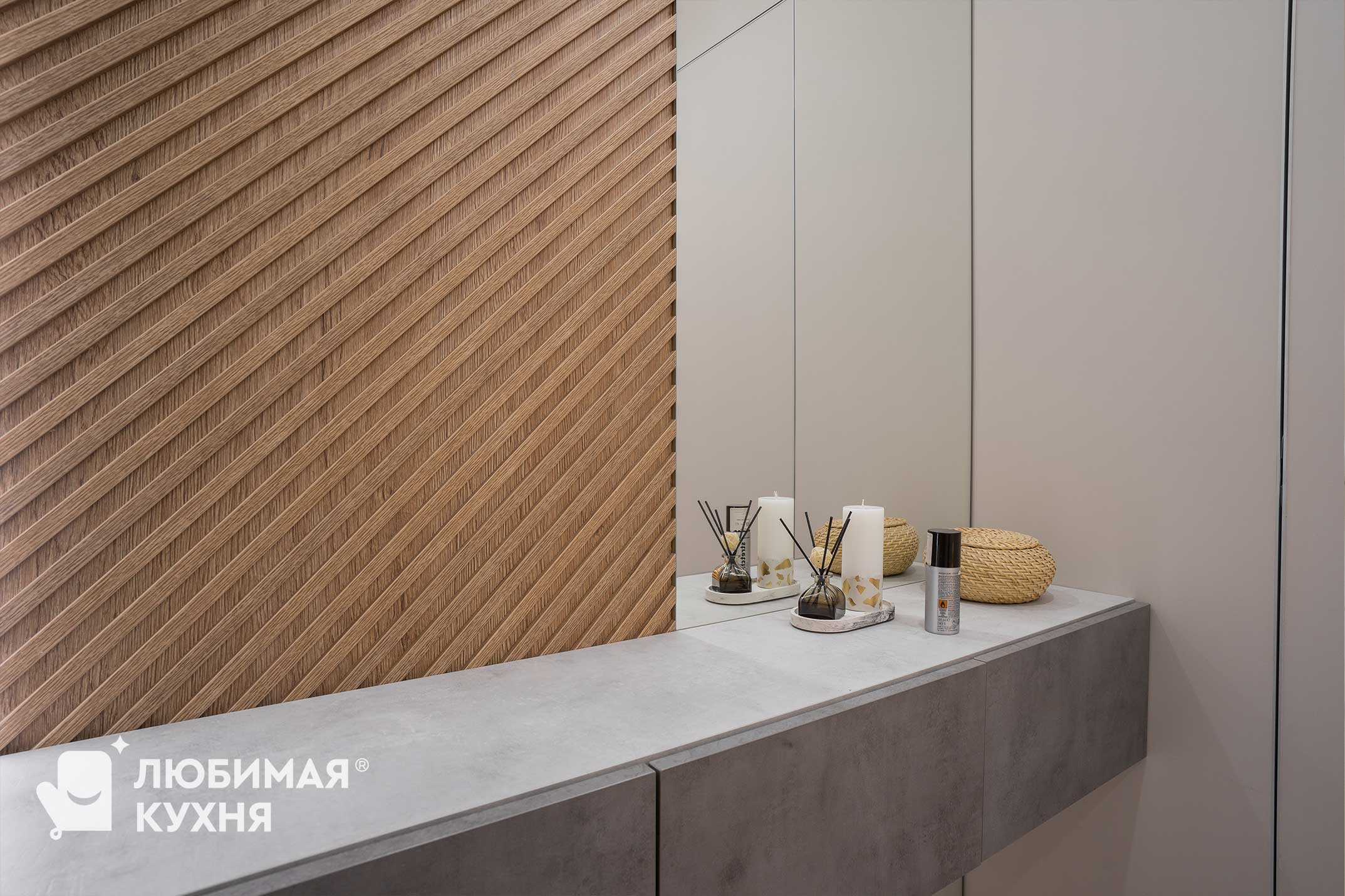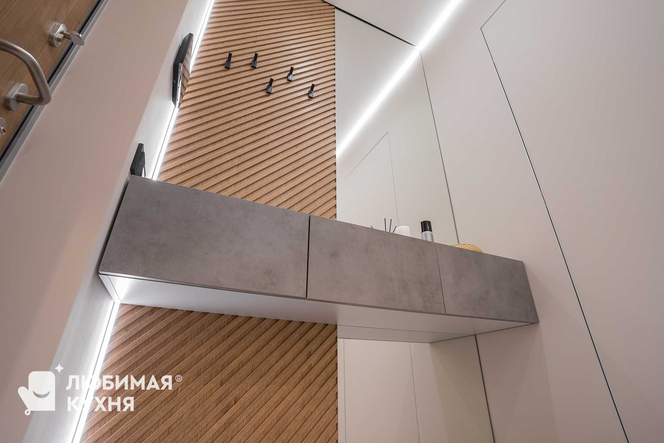 Подвесная консоль — очень удобное и минималистичное решение для прихожей. Не занимает много места, вниз можно потавить пуф для комфортного одевания обуви. А в большое зеркало можно полюбоваться на себя в полный рост.