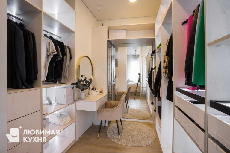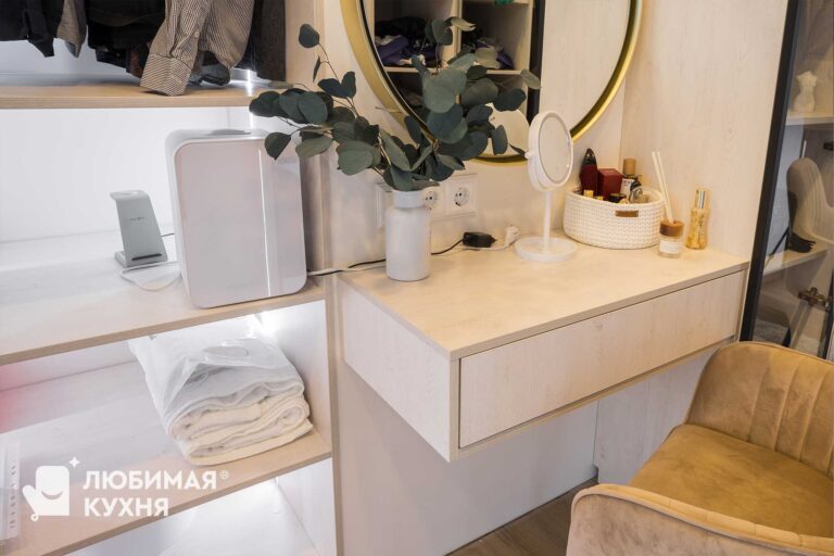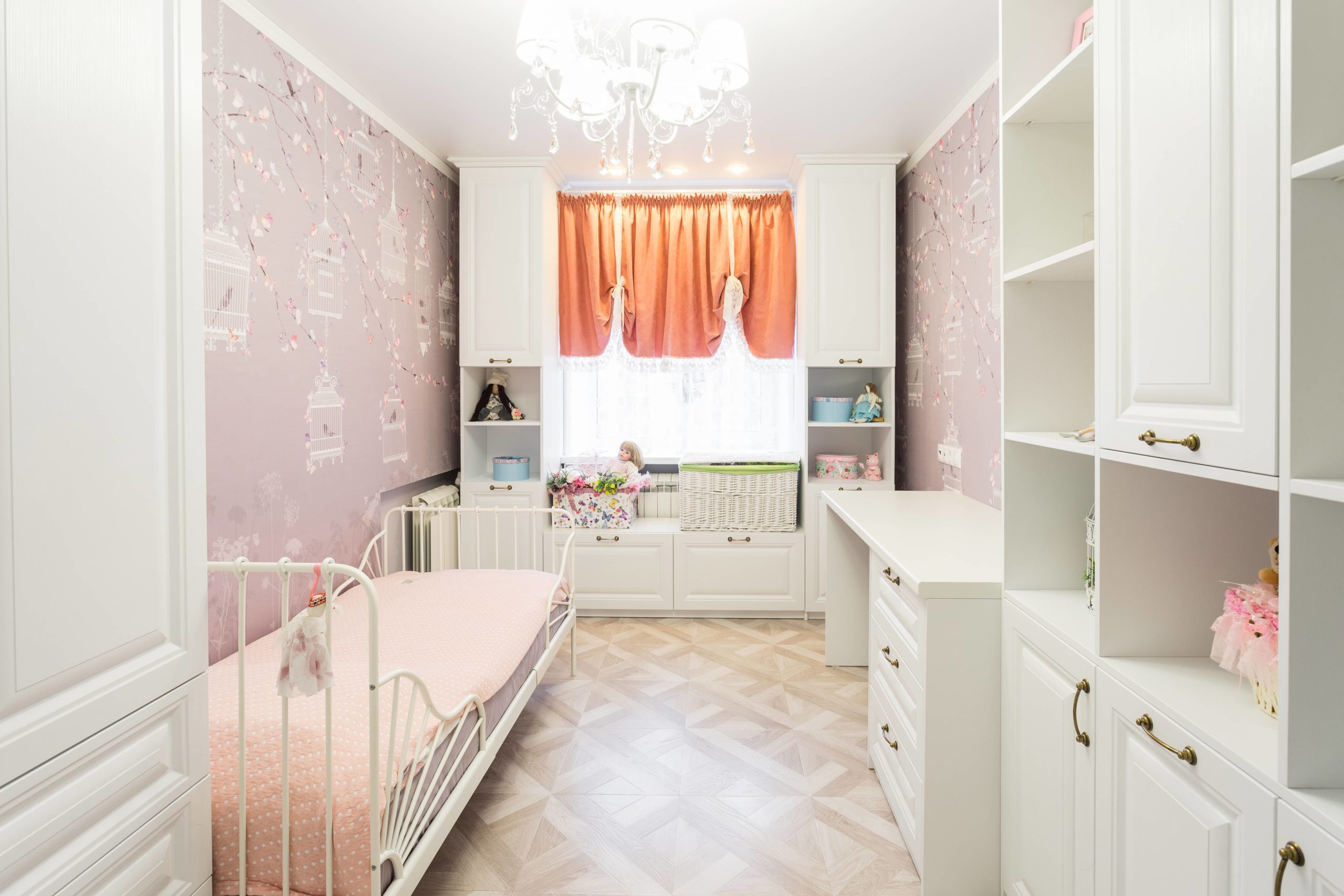 Невероятно легкая и нежная детская для девочки в стиле современная классика. Вся мебель выполнена в светлых тонах. что визуально расширяет пространство. Изящные фасады с фрезеровкой как бы обрамляют всю комнату, создавая атмосферу спокойствия и уюта. Детская состоит из углового шкафа-купе, письменный стол, стенка с местом для сидения, шкаф с открытыми полками для книг и игрушек.