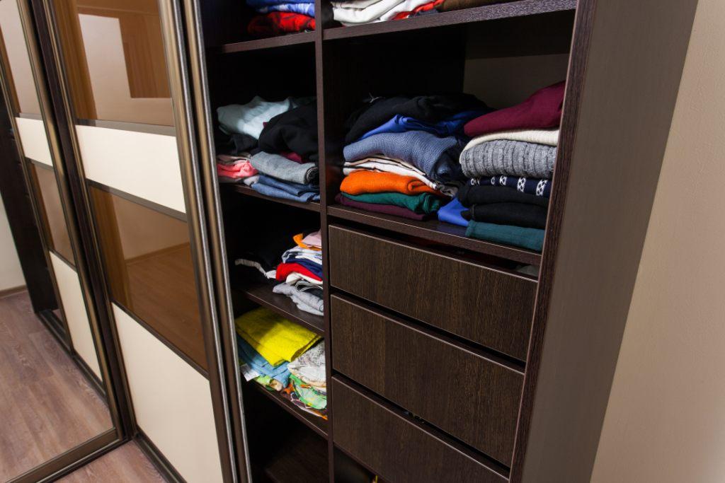 Встроенный угловой шкаф для большой семьи, внутри секция со штангой для одежды, три ящика с направляющими полного выдвижения. Шкаф состоит из трех отделений. В первом отделении антресольная полка и штанга для длинных вещей. Во втором отделении антресольная полка и двухуровневая секция для коротких вещей. В третьем отделении полки по всей высоте шкафа с тремя ящиками полного выдвижения.