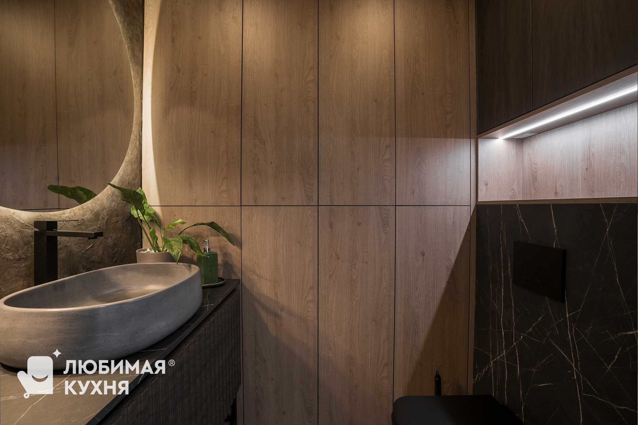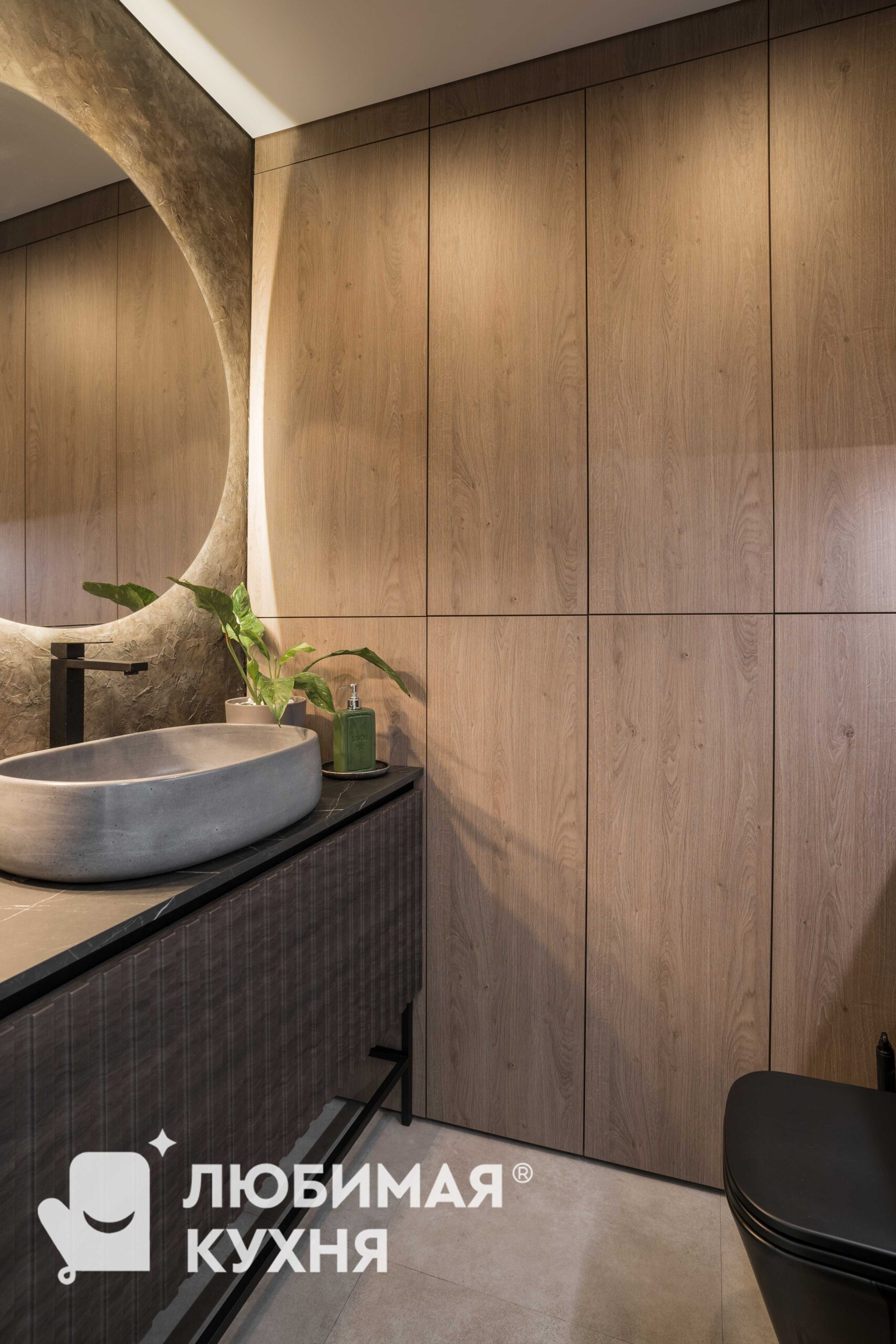 Брутальный санузел для любителей находится в уединении. Брутальная тумба с вместительными ящиками под раковину с металлической опорой и рифлеными фасадами плавно переходит в невероятно вместительные пеналы, в которых предусмотрены системы хранения. Над инсталляцией — полка с подсветкой и шкафом. Каждый сантиметр данного санузла использован по максимуму благодаря грамотной планировке.