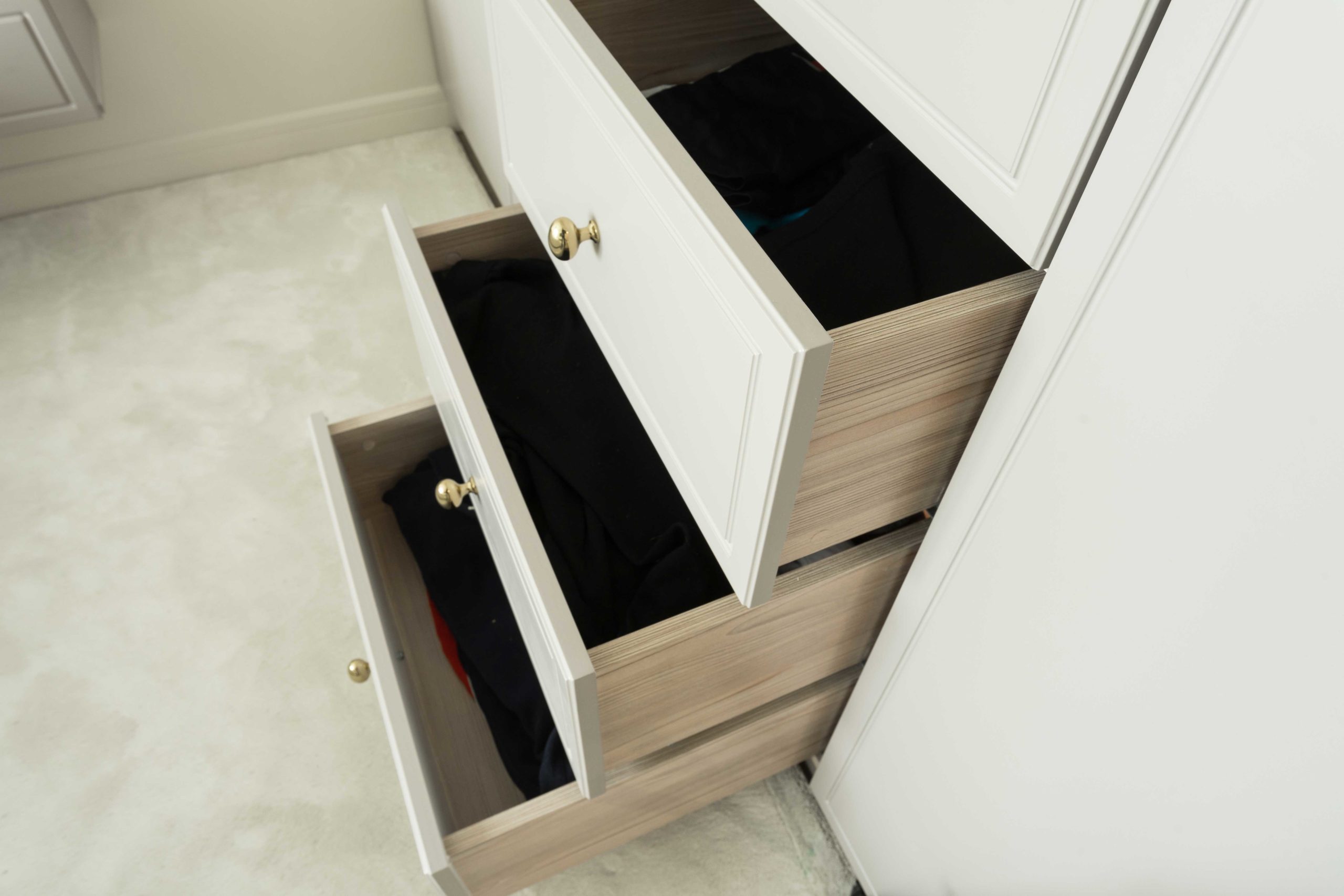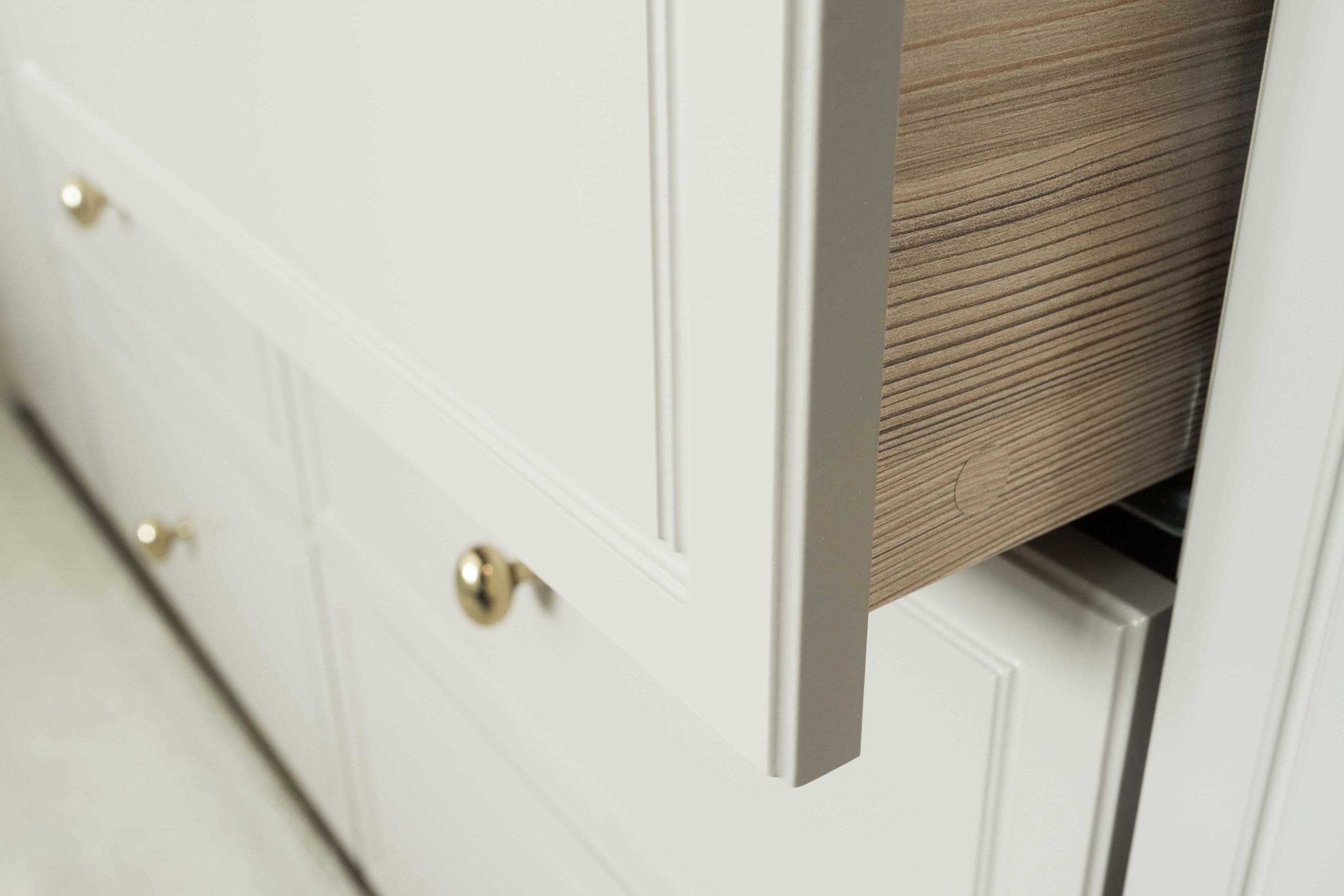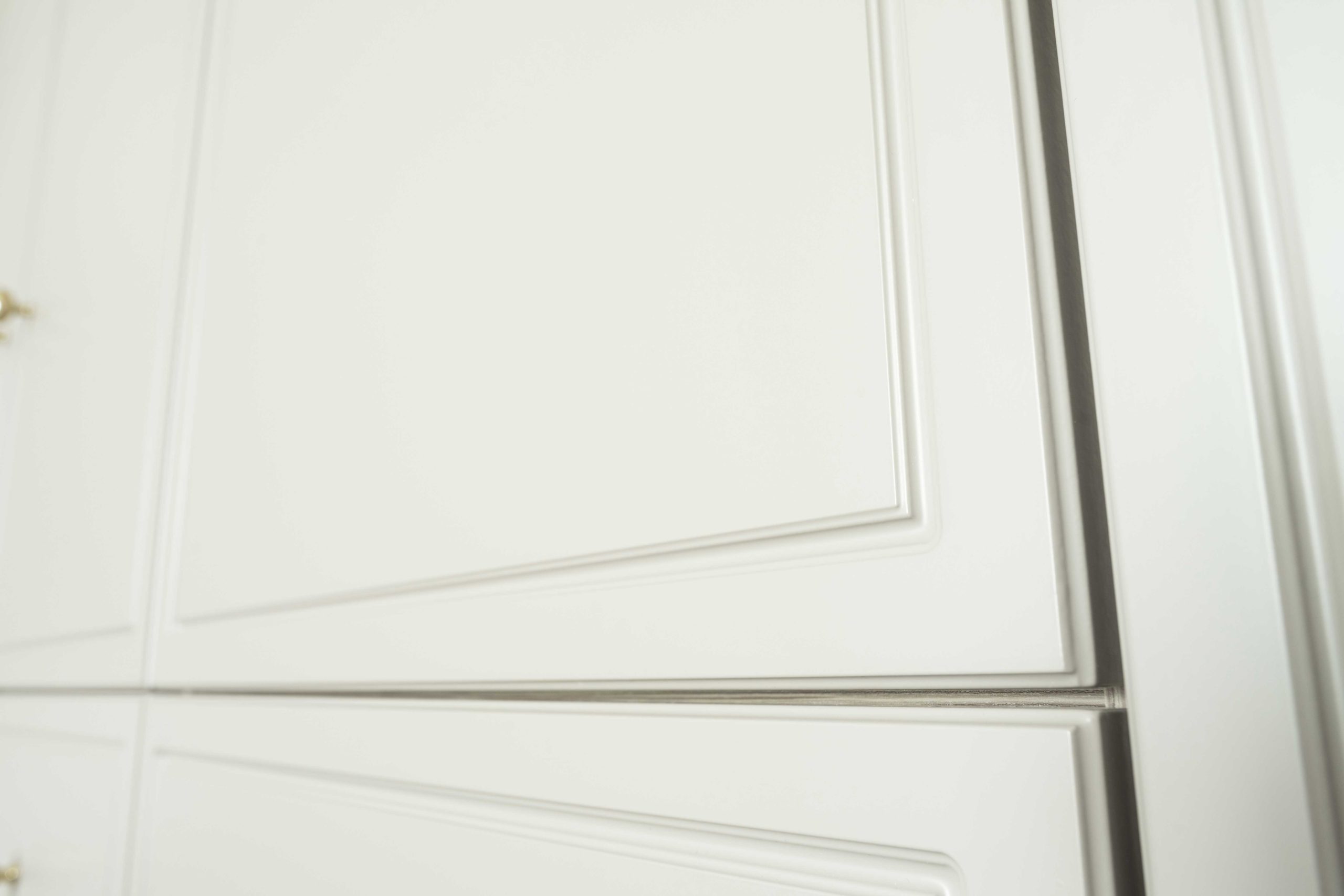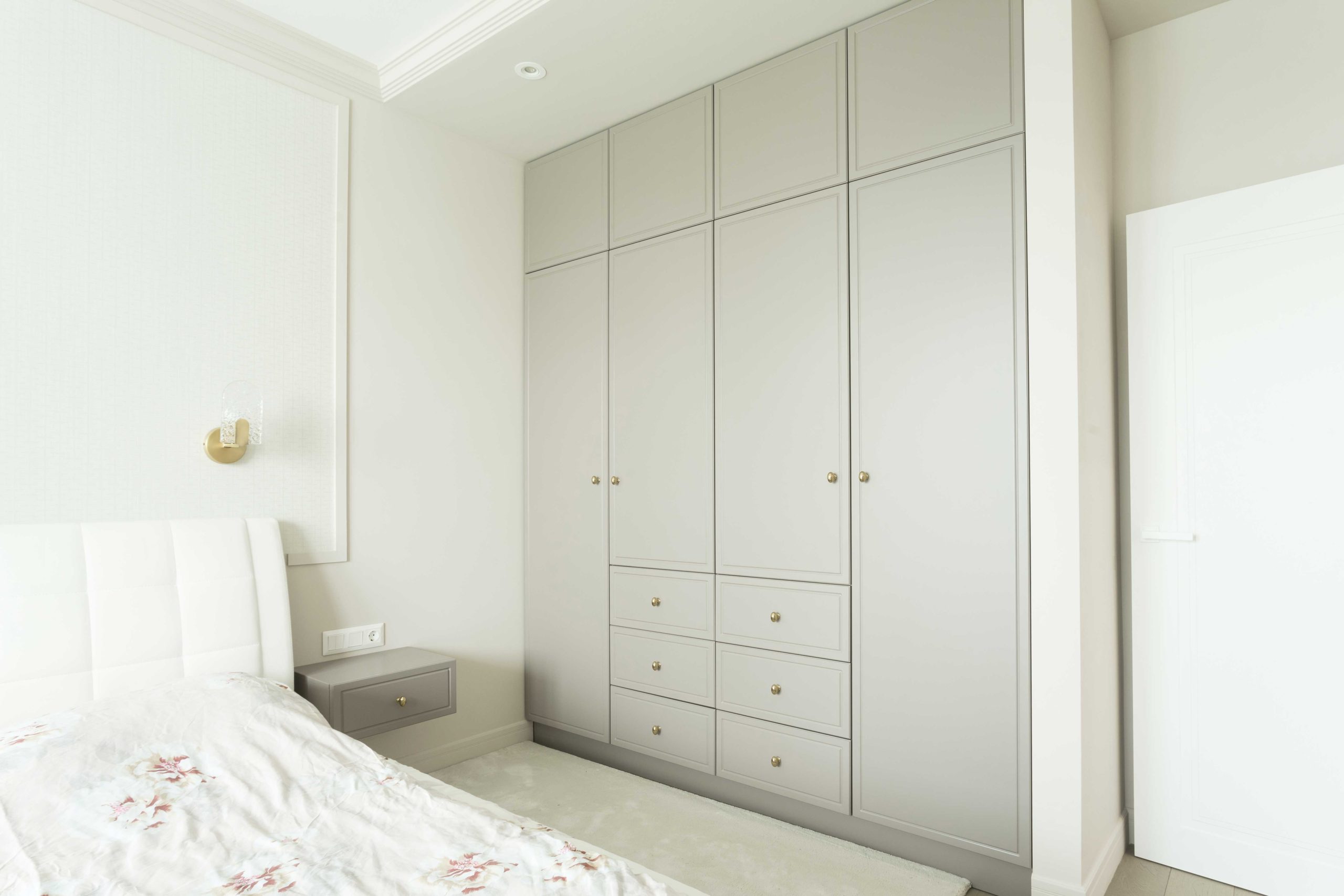 Изящный шкаф в стиле современная классика прекрасно вписывается в пространство спальни. Тончайшая фрезеровка и сдержанный цвет выглядят невероятно легко и красиво. Шкаф встроен в нишу, что маскирует его глубину и позволяет избежать членения пространства.