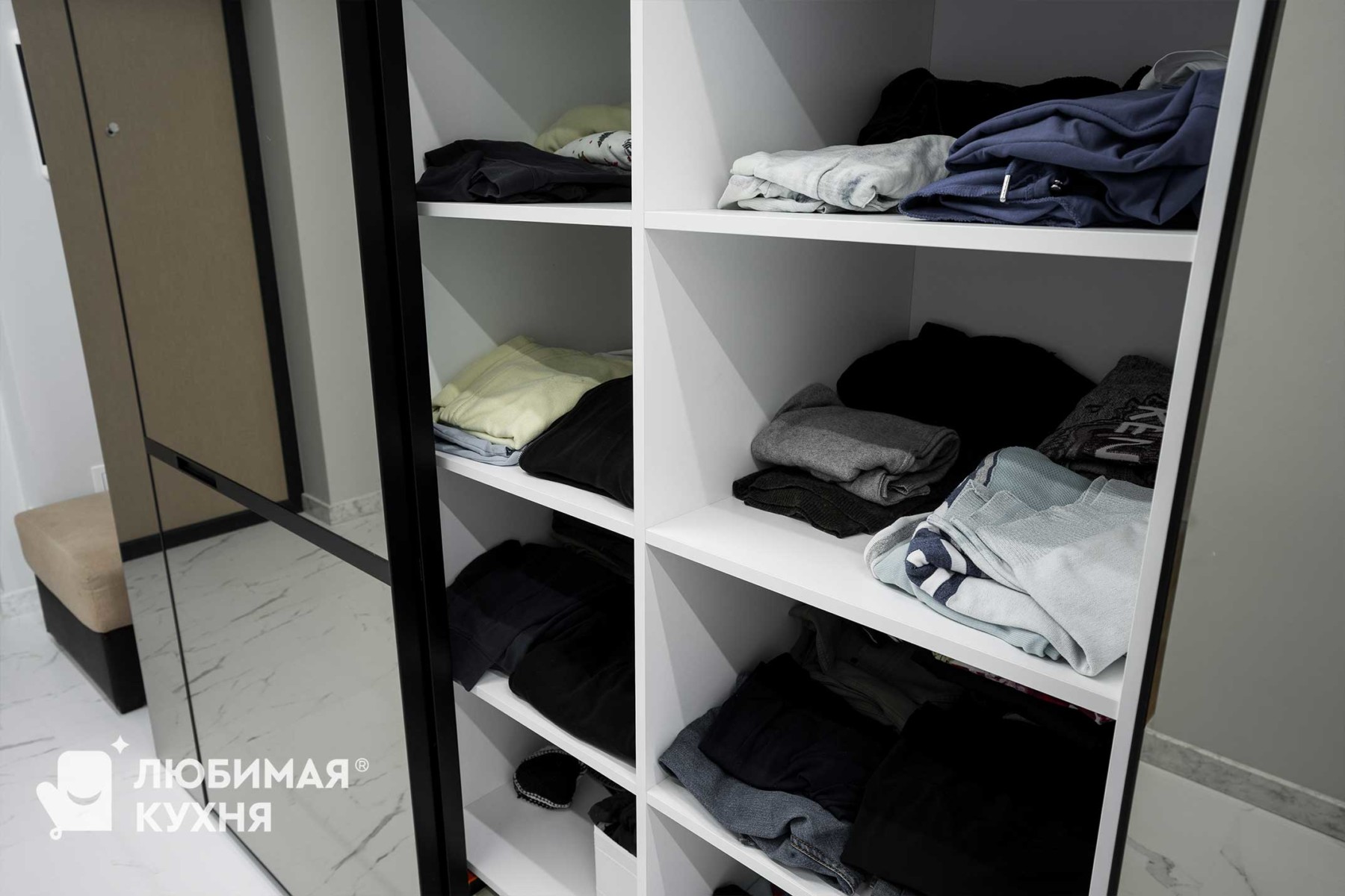 Шикарный шкаф-купе с большими зеркальными дверьми расширили границы прихожей. Кажется, что здесь существует зазеркалье. А оно и правда существует! За дверьми вмещается столько всего. Мы расширили границы его вместимости благодаря грамотному и современному наполнению — пантограф, корзины для обуви, полки и ящики нужного размера. Мы расширили границы удовольствия от пользования шкафом благодаря современным материалам и фурнитуре — двери легко и бесшумно открываются и закрываются без стука с помощью доводчика. Современное наполнение шкафа позволяет использовать каждый сантиметр пространства по максимуму — пантограф, корзины для обуви, полки и ящики нужного размера.