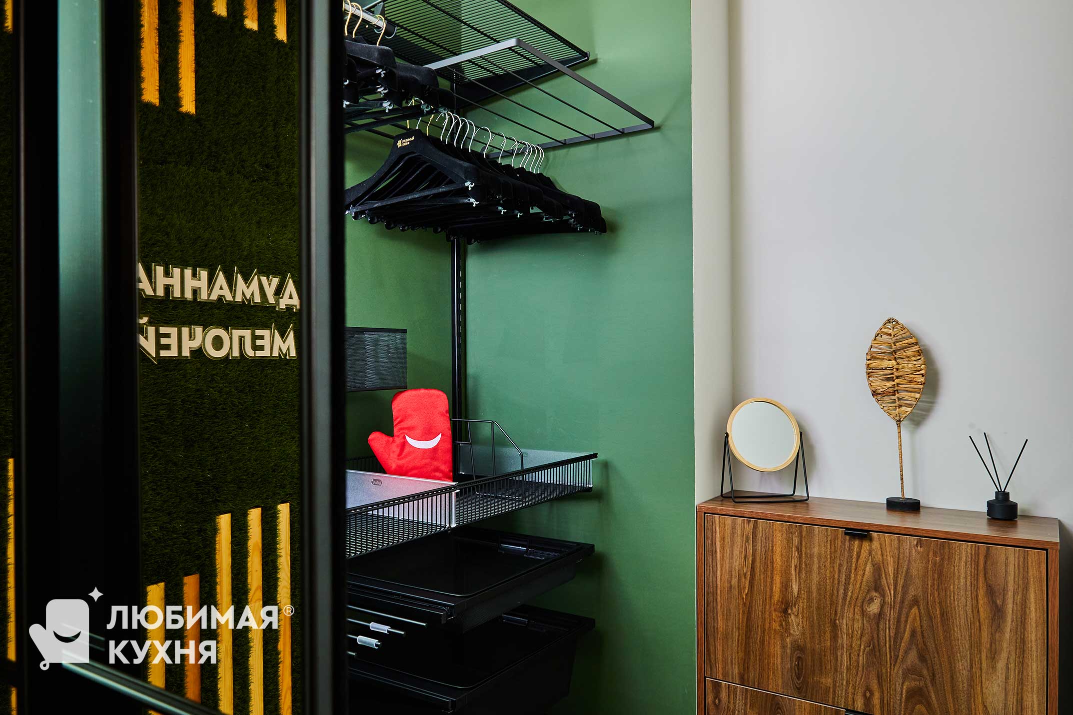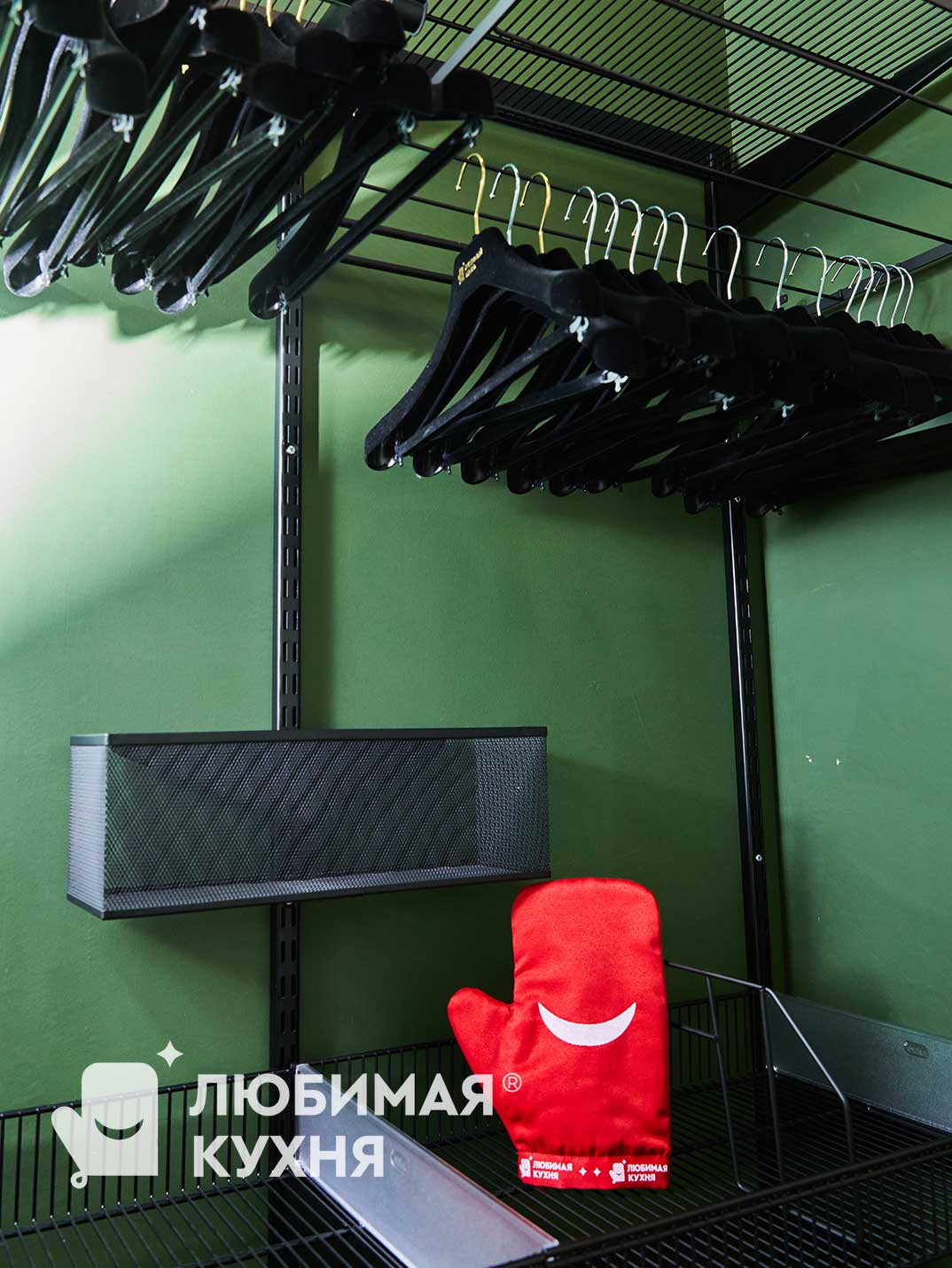 Гардеробная оформлена в современном стиле с акцентом на функциональность и эстетику. Глубокий зеленый цвет — создает уютную атмосферу, а контрастные детали, в виде черных полок и вешалок, добавляют современный оттенок. Гардеробная оборудована открытыми металлическими полками и вешалками, что обеспечивает легкий доступ к одежде. На нижнем уровне расположены выдвижные ящики для хранения аксессуаров и мелочей. Гардеробная сочетает в себе практичность и стиль, создавая комфортное пространство для хранения одежды и аксессуаров.