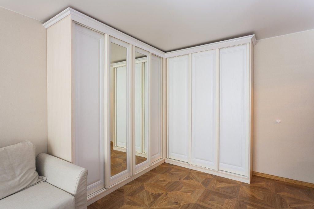 Корпусный угловой шкаф-купе. Профиль Aristo, цвет-дуб беленый, ручка Flat.