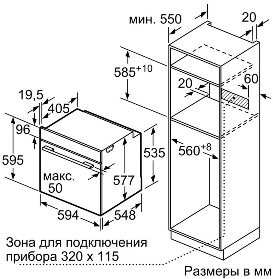 - Размеры ниши для встраивания, см (В х Ш х Г) — 58.5-59.5 х 56-56.8 х 55
