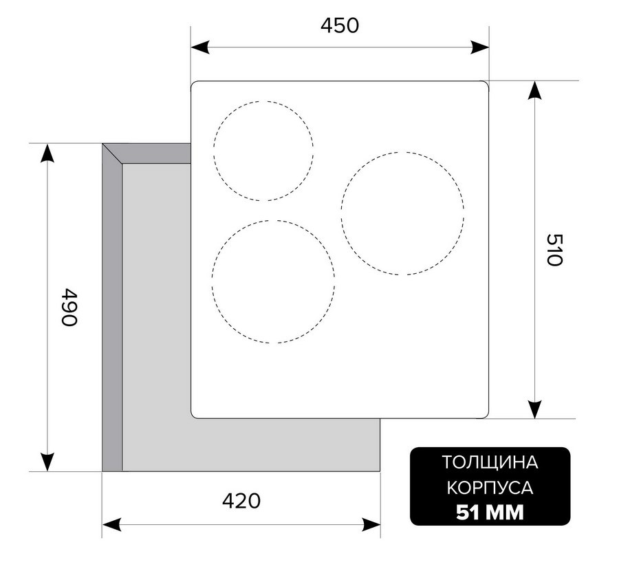 - Глубина варочной поверхности — 52 см