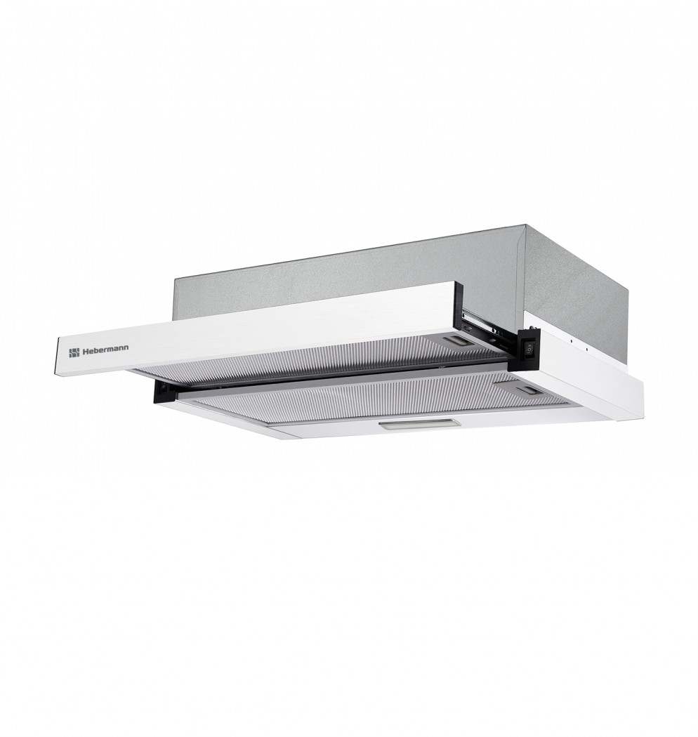 Hebermann HBFH 60.1 W – встраиваемая вытяжка с выдвижным экраном. Такая конструкция особенно удобна для небольшой кухни, так как не будет скрадывать пространство. Ширина этой модели 60 см, она подойдёт для установки над варочными панелями и плитами соответствующего размера.
