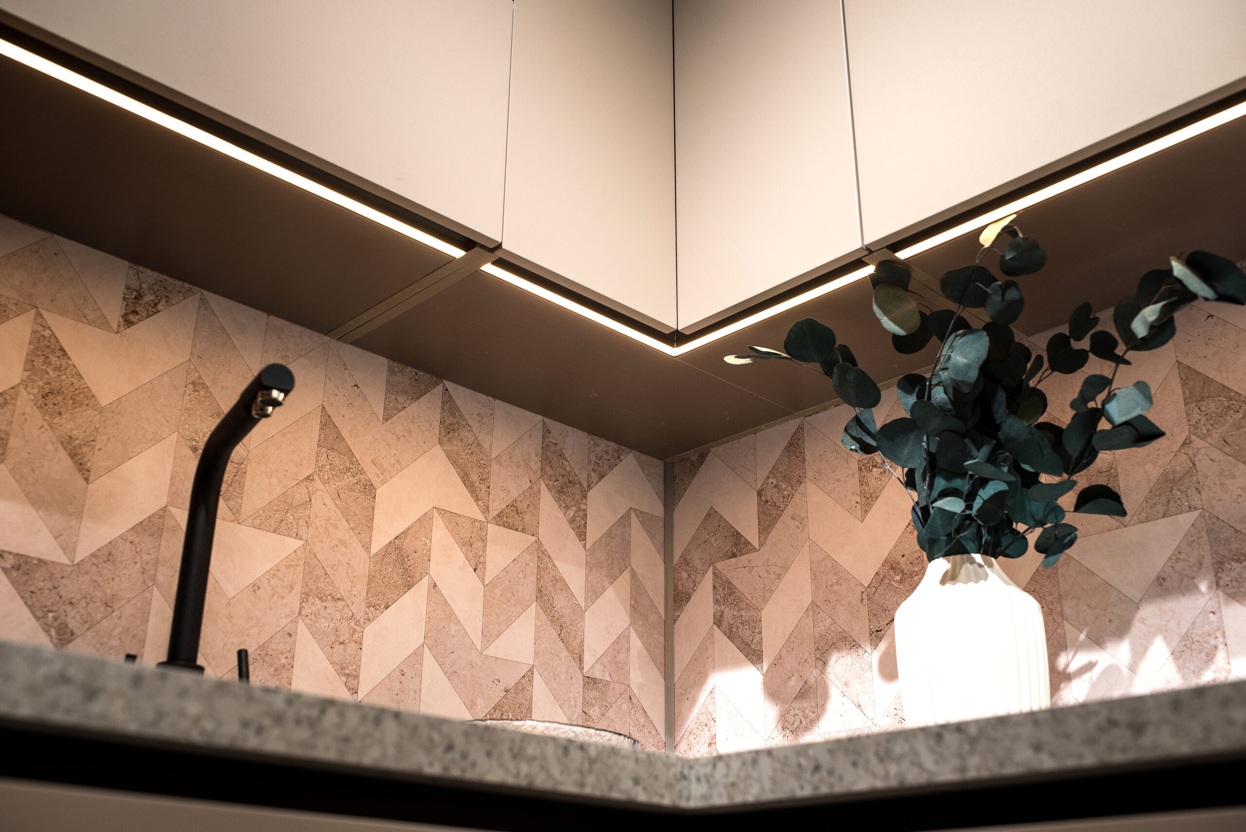 Можно выбрать декор под цвет столешницы,а можно напечатать рисунок с имитацией плитки